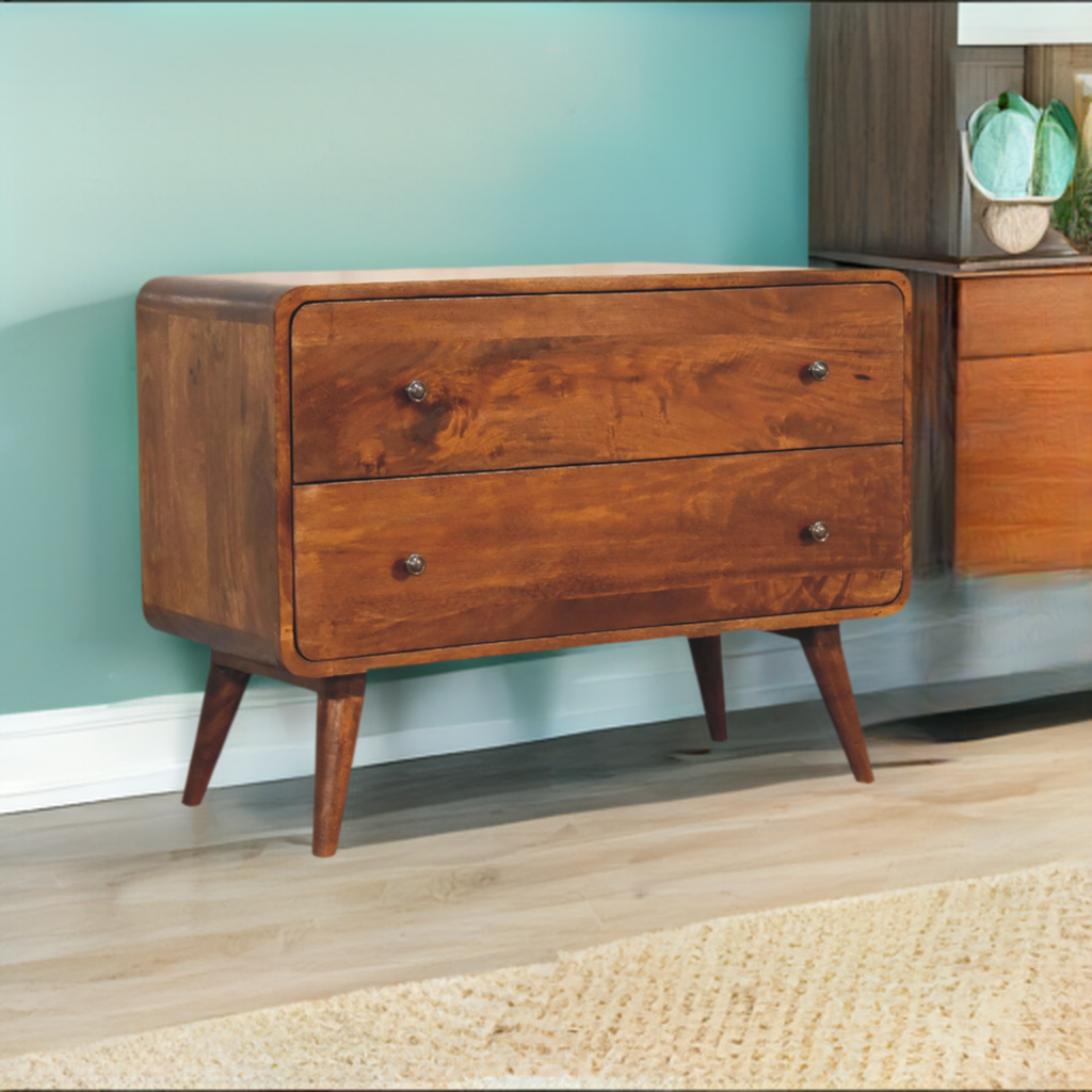 To match the other products from the curved collection, this 2 drawer chest has been constructed from 100% solid mango wood in a rich chestnut finish and stands on 4 Nordic style legs. It features shiny accent knobs on each drawer providing easy access when storing any clothes, towels, duvets, etc. The curved design provides smooth, safe corners and gives the product a modern and contemporary look which is perfect for city homes and apartments.