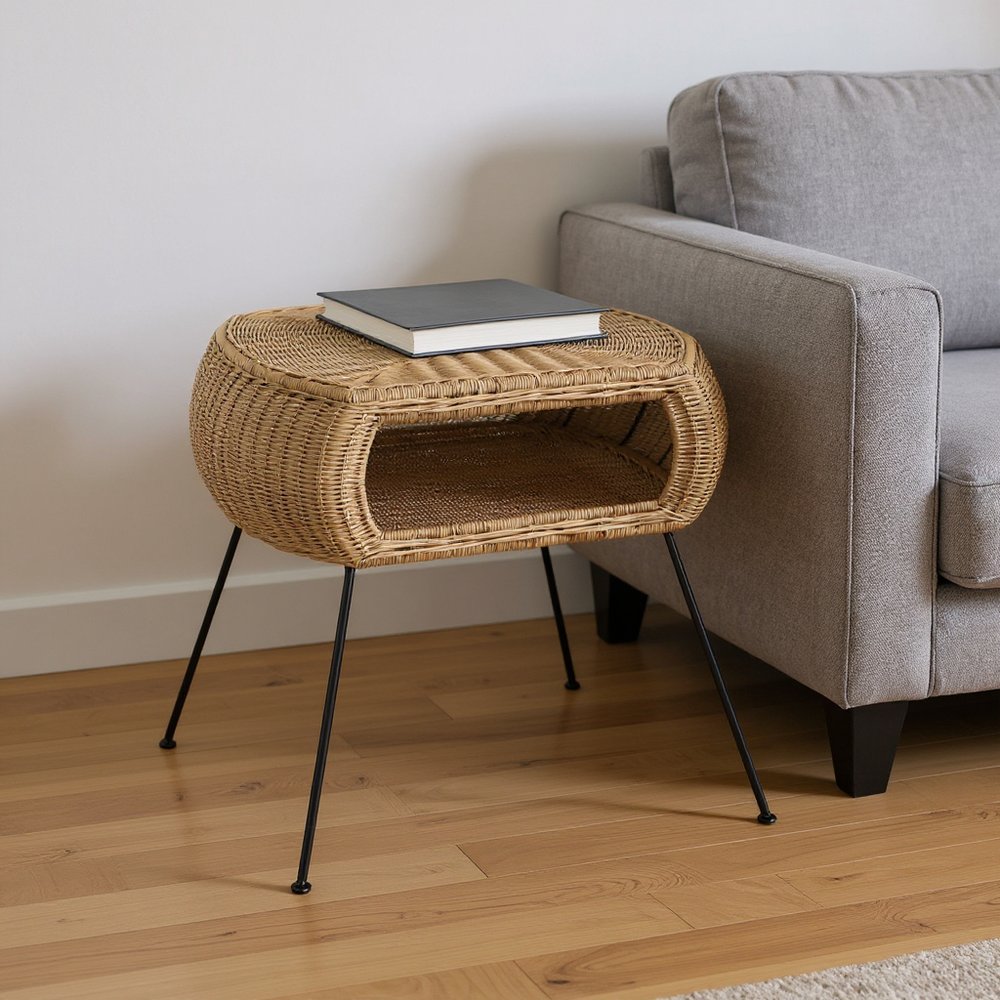 24" Black And Brown Distressed Rattan And Iron Round End Table With Shelf