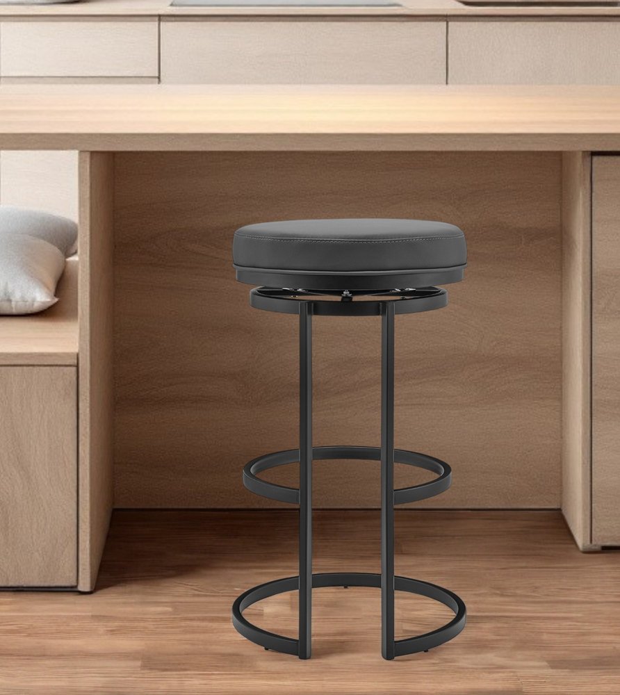 26" Gray And Black Faux Leather And Iron Swivel Backless Counter Height Bar Chair