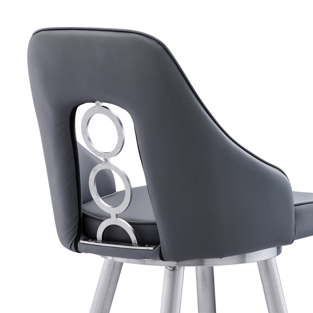 26" Gray And Silver Faux Leather And Iron Swivel Counter Height Bar Chair