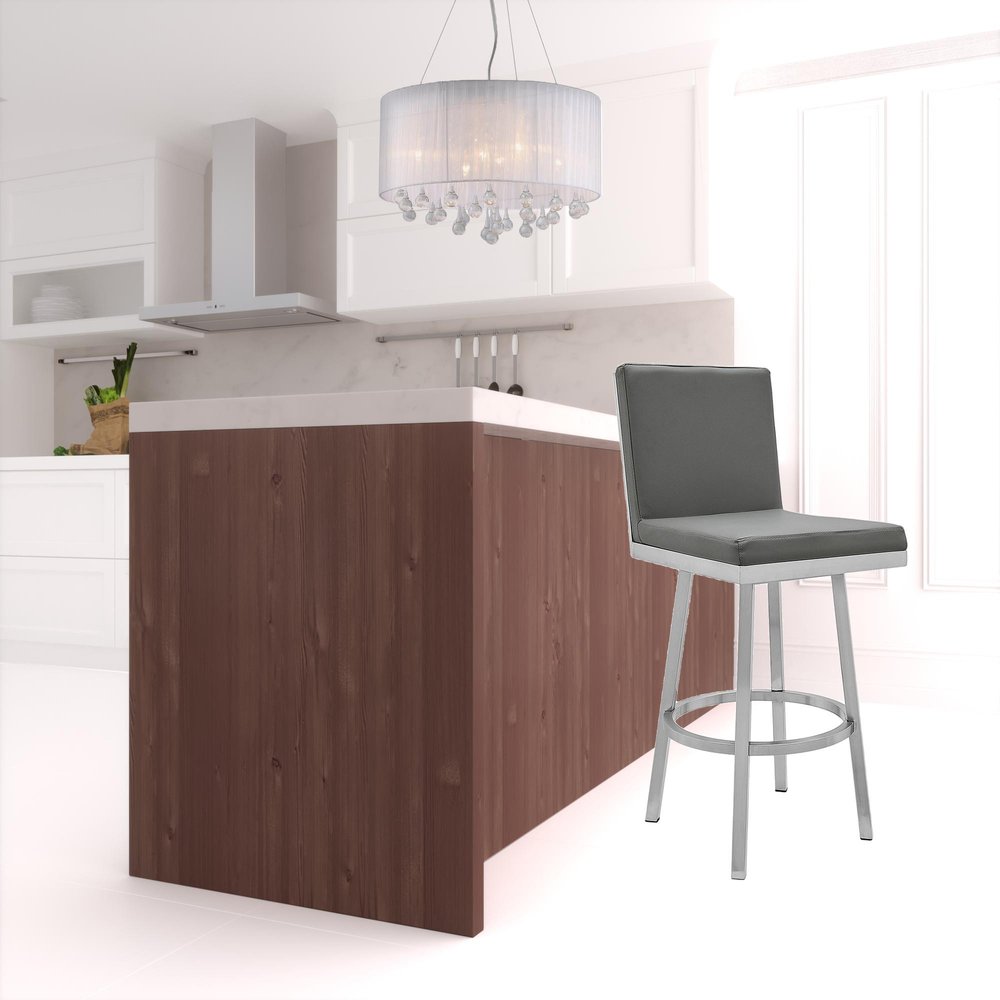 30" Gray And Silver Faux Leather And Iron Swivel Bar Height Bar Chair