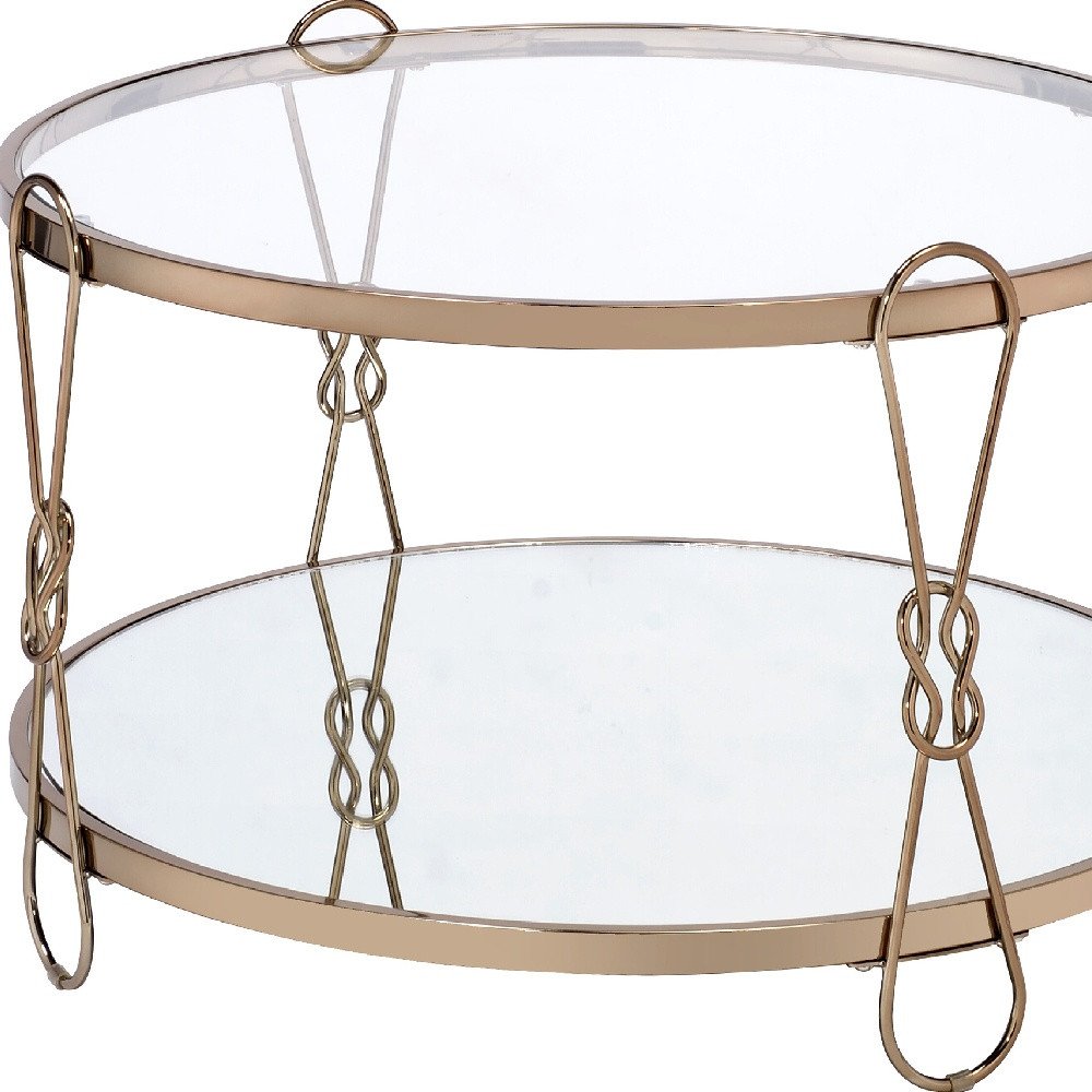 32" Silver and Champagne Mirrored Glass And Metal Round Frame Coffee Table With Shelf