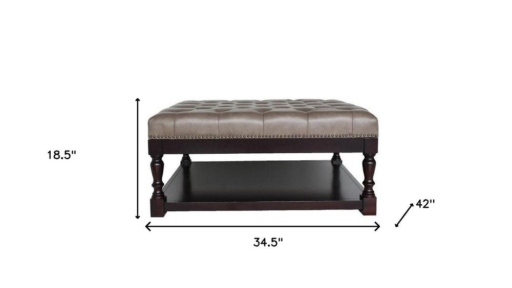 35" Gray And Dark Brown Leather And Solid Wood Coffee Table With Shelf