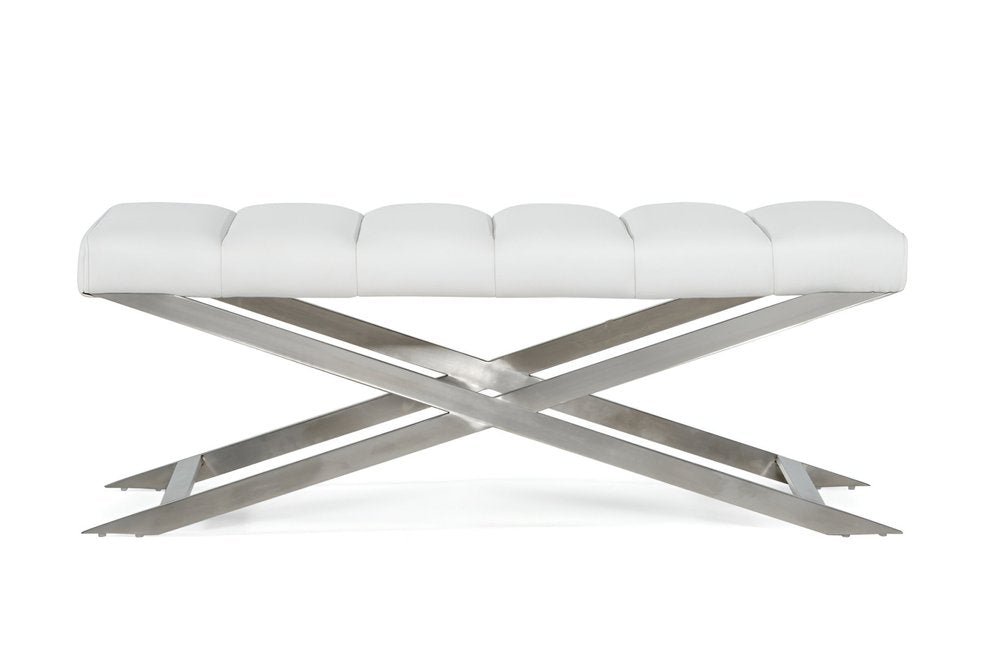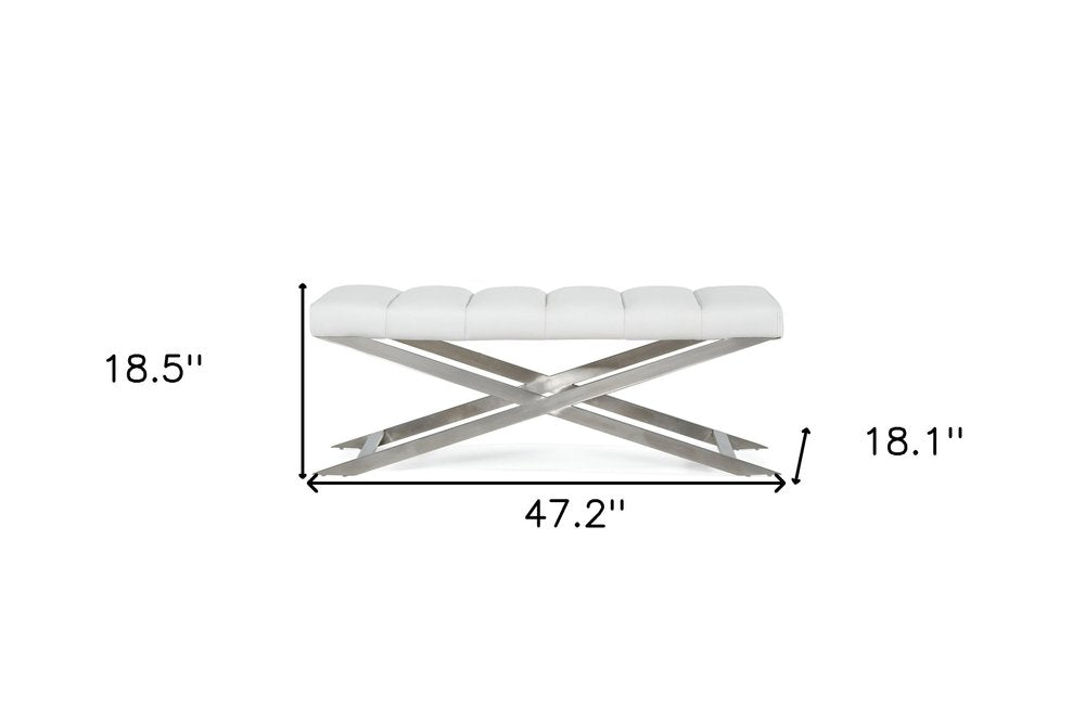 47" White and Silver Tufted Faux Leather Upholstered Dining Bench