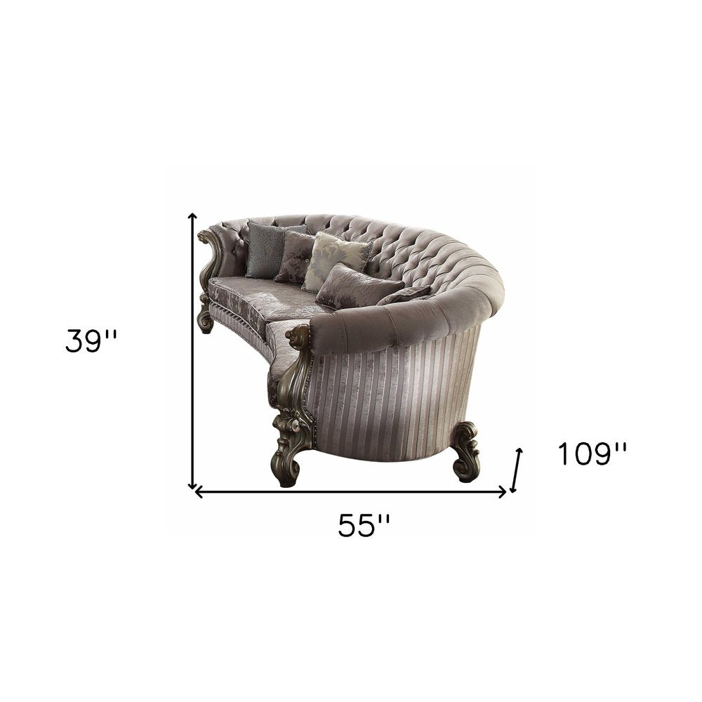 55" Gray Velvet Curved Floral Sofa And Toss Pillows With Champagne Legs