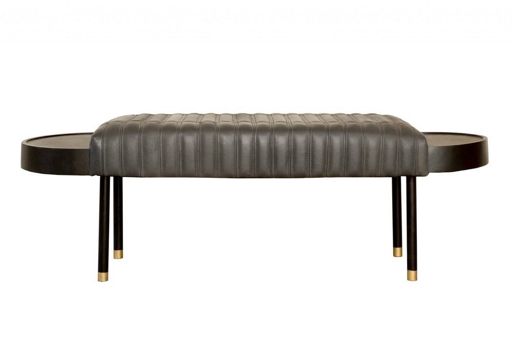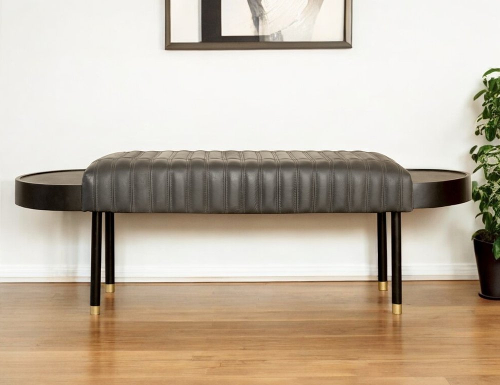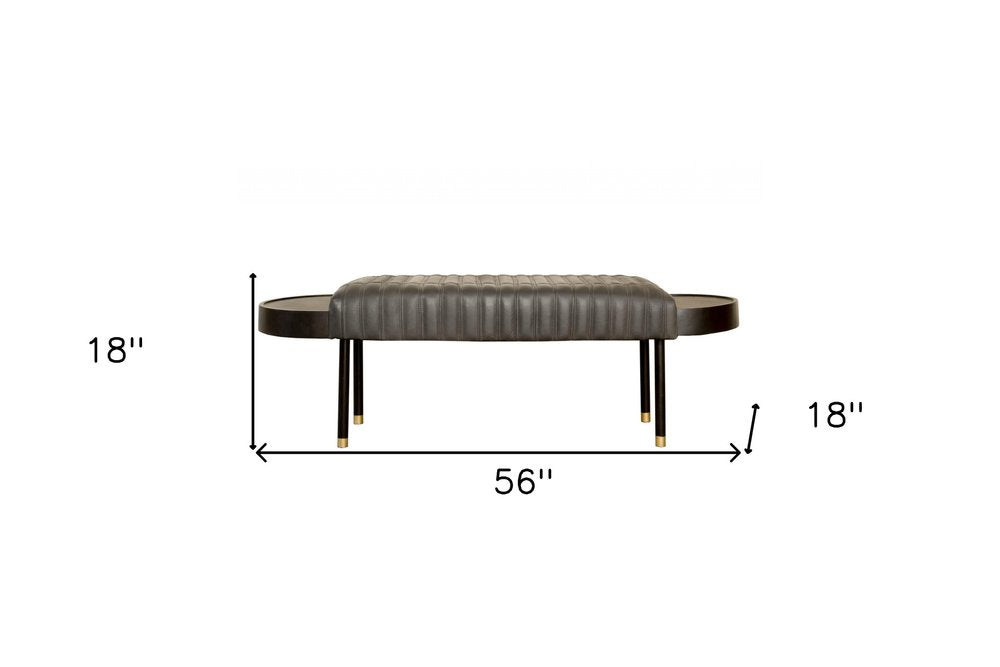 56" Dark Gray and Black Upholstered Genuine Leather Bench