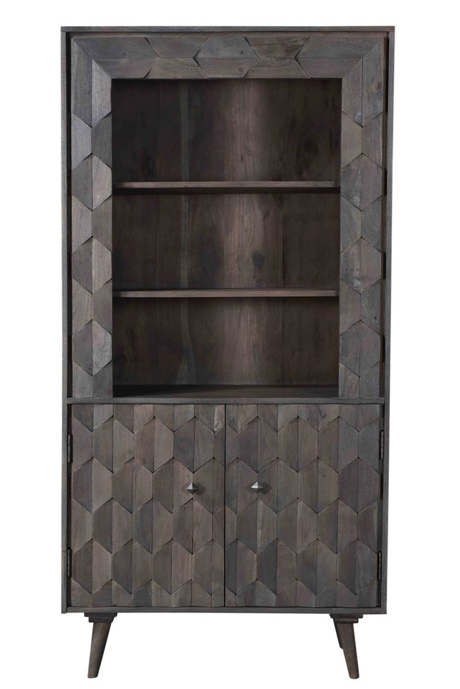 70" Gray Distressed Solid Wood Three Tier Bookcase with Two Doors