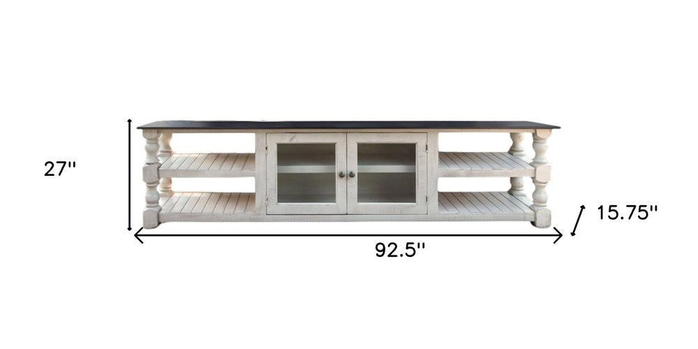 93" Gray and Ivory Solid Wood Cabinet Enclosed Storage Distressed TV Stand