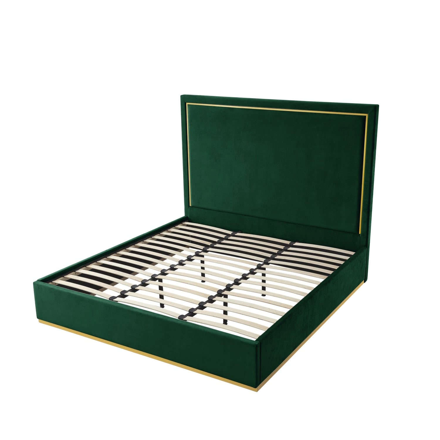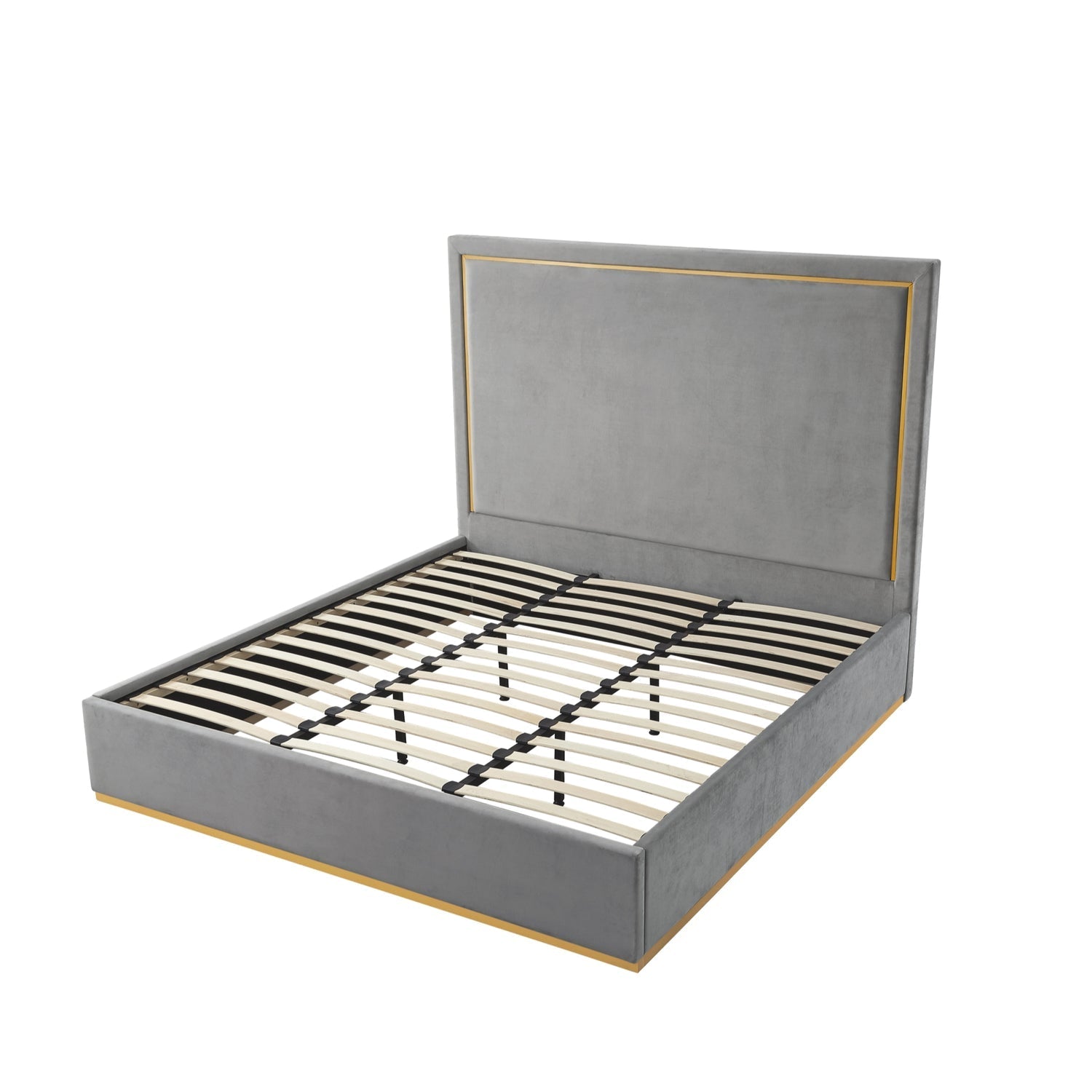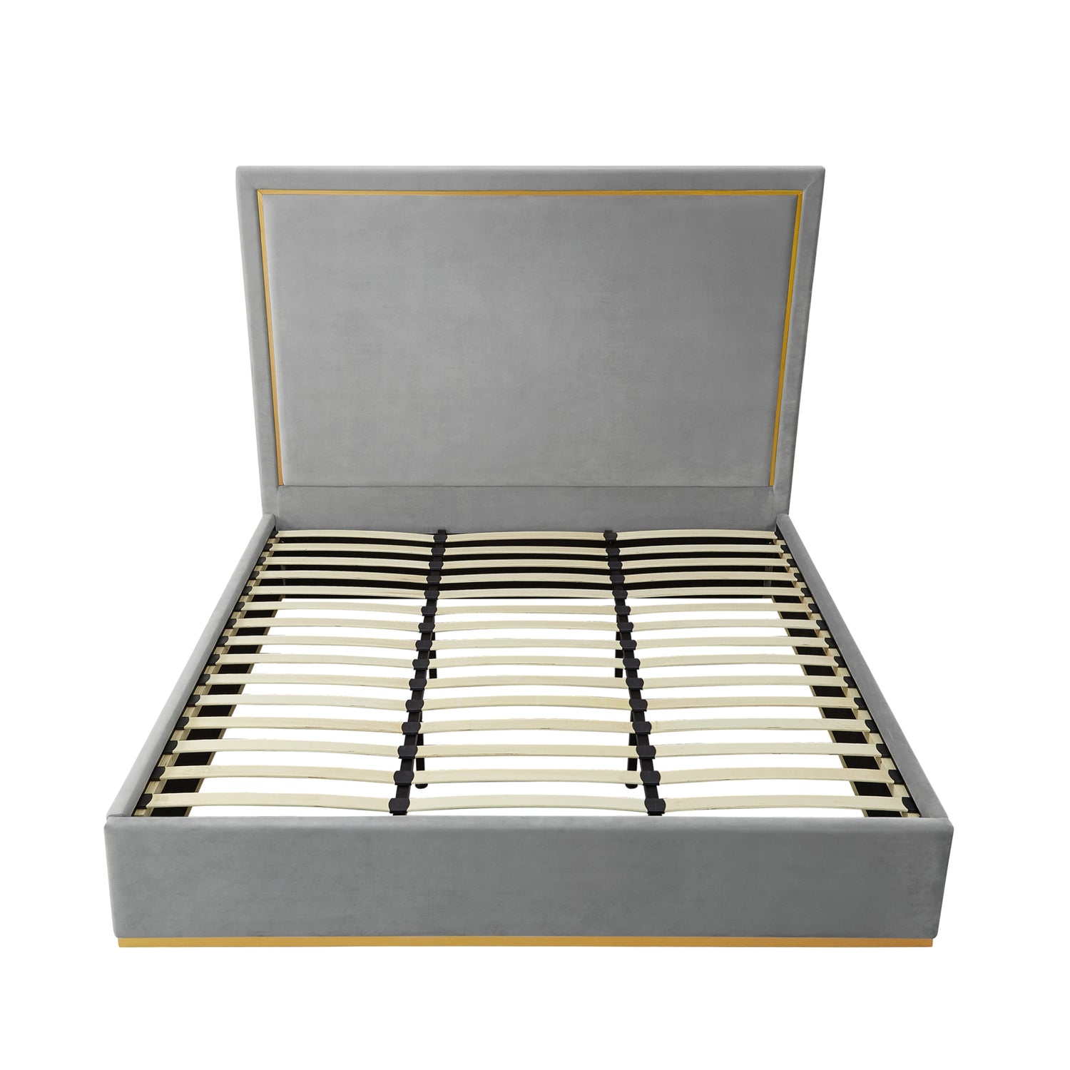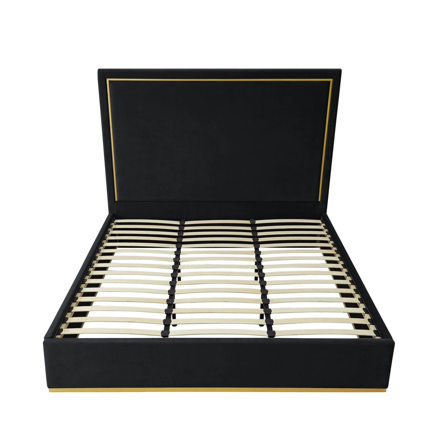 - ATTRIBUTES: Upholstered, Powder Coated Gold Frame and Base, Slats Included