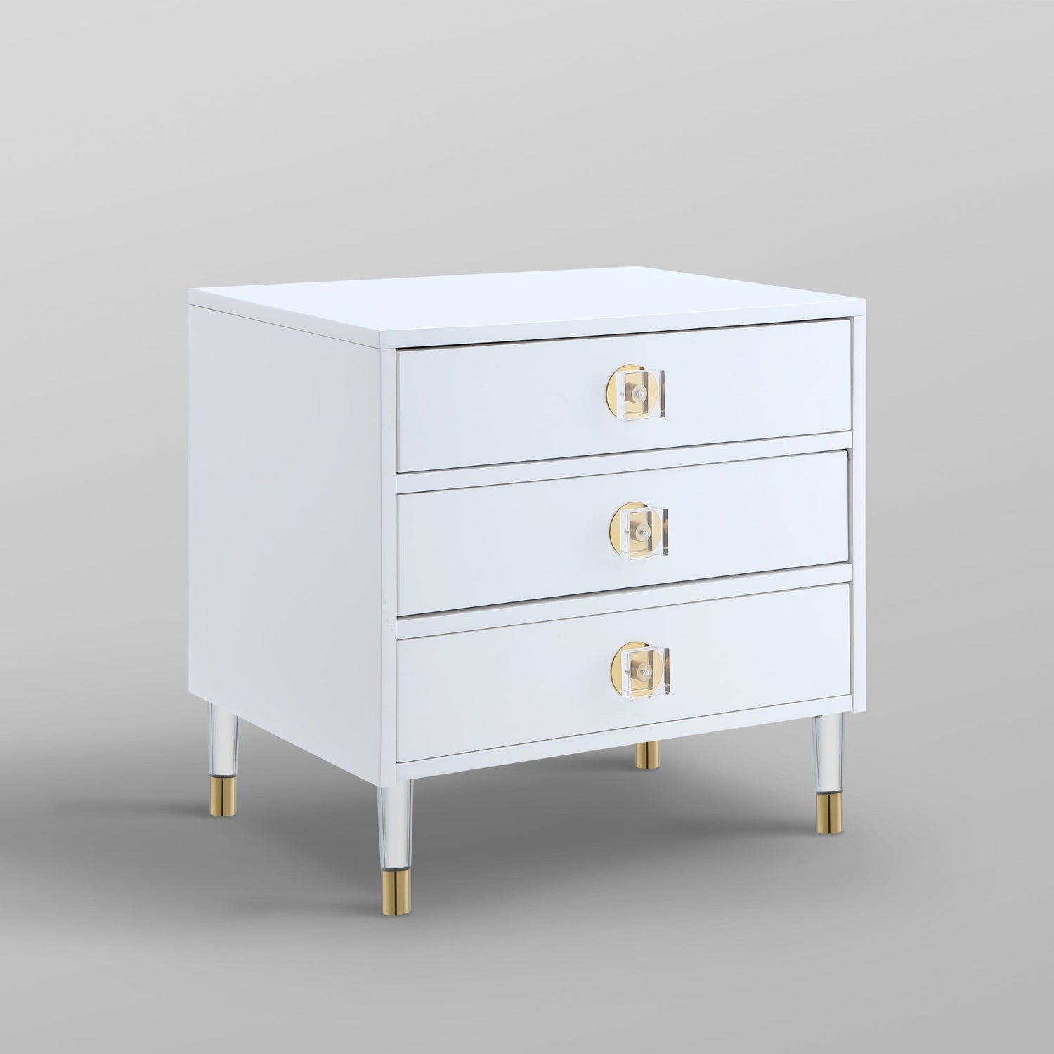 - ATTRIBUTES: 3 Drawers, High Gloss Finish, Acrylic/Gold Knobs and Legs