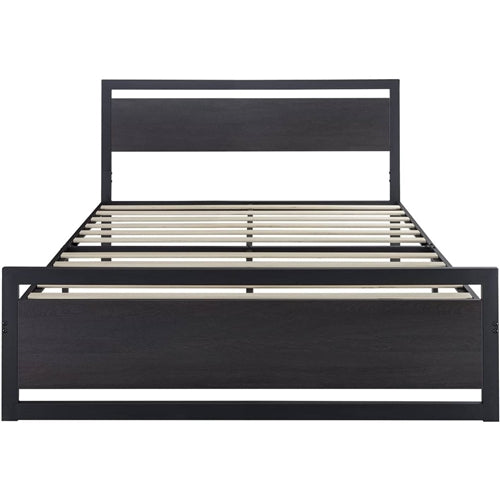 - Black Metal Platform Bed Frame with Wood Panel Headboard and Footboard