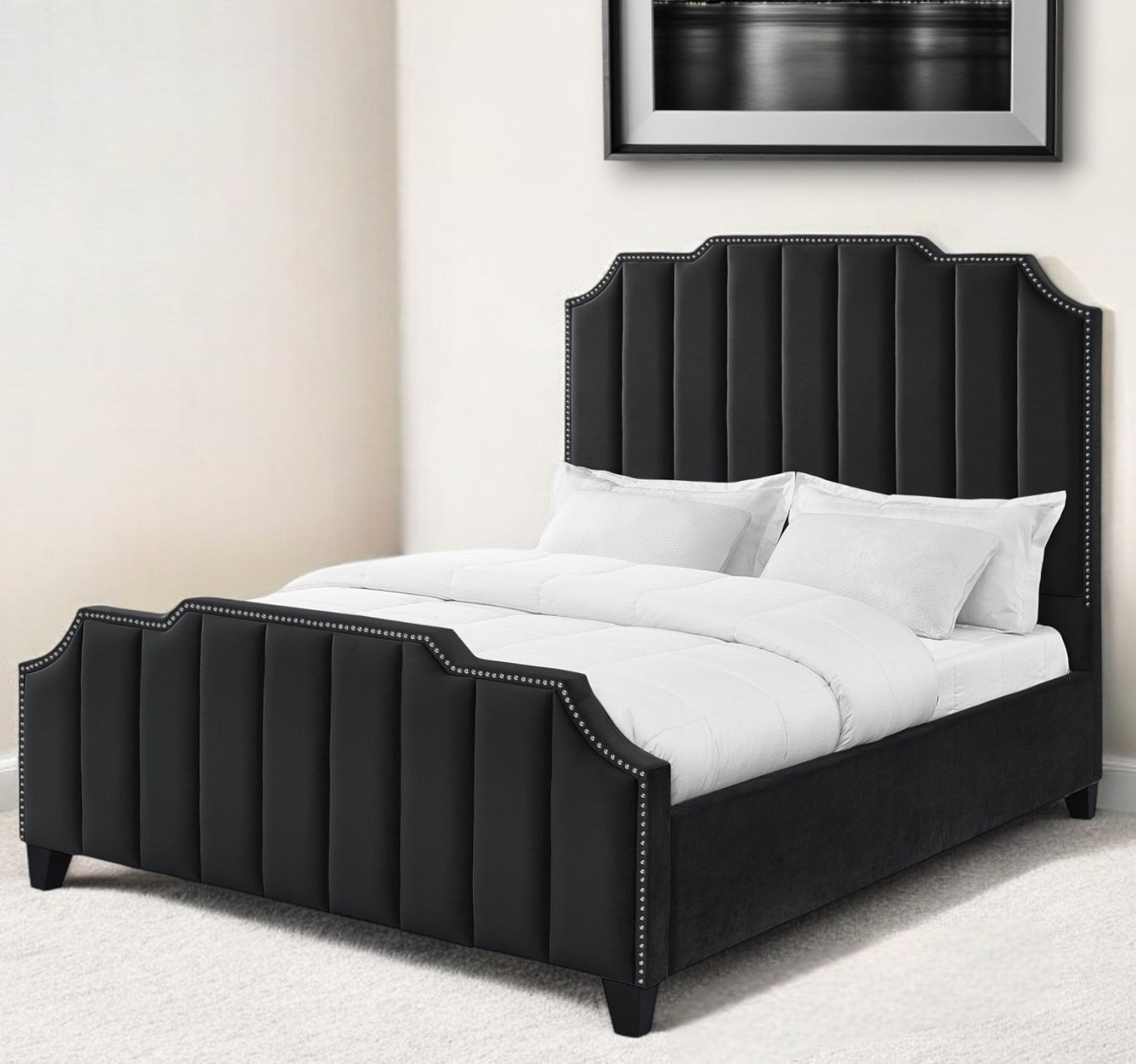 Black Solid Wood King Tufted Upholstered Velvet Bed with Nailhead Trim