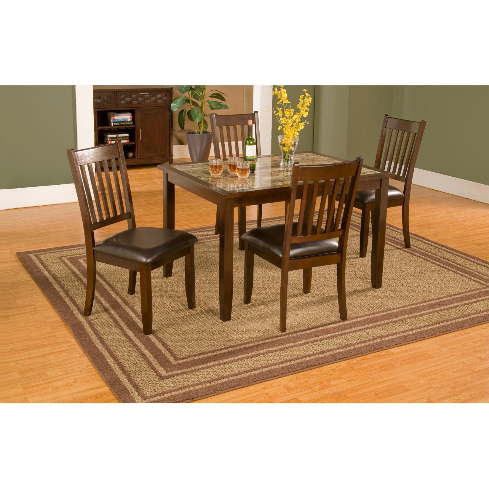 Good things come in small packages. Capitola combines an Espresso finish with a Faux Marble top and Faux Leather on the side chair. Sturdy, solid construction on both the table and chairs. Crafted from Rubberwood wood solids the group is an incredible value. This 5-piece set is a great way to make a statement without breaking the budget.