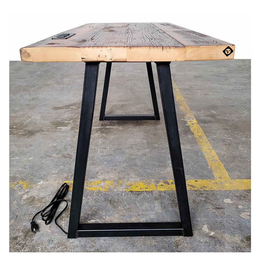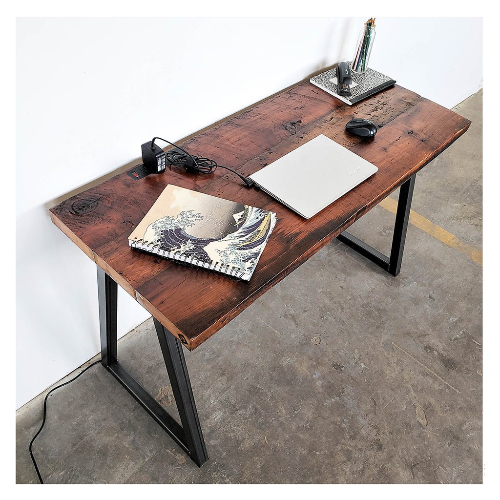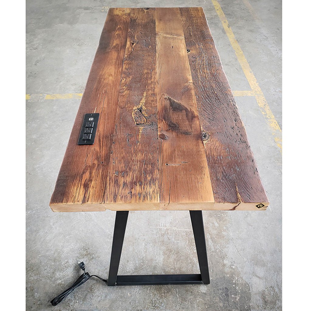 Modern, custom wood office desk handcrafted from reclaimed solid old-growth pine and American made steel with fully integrated power Outlet.