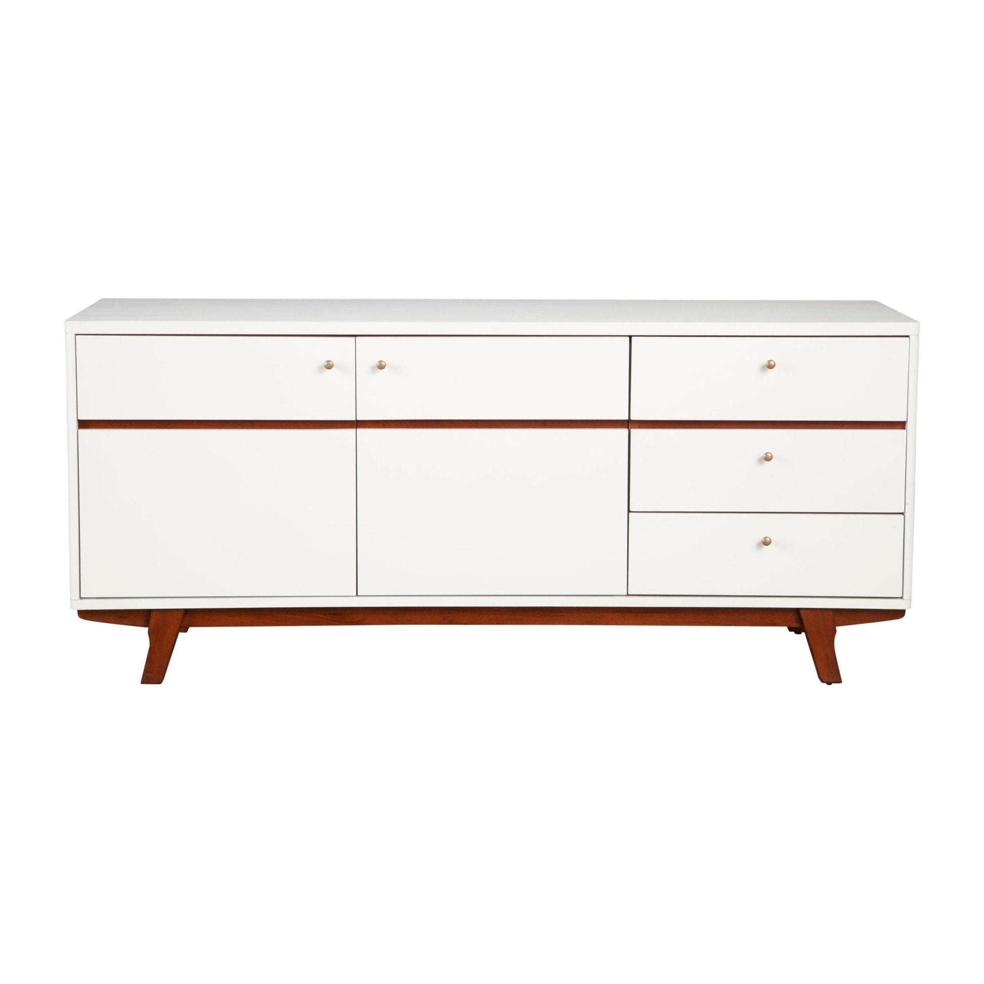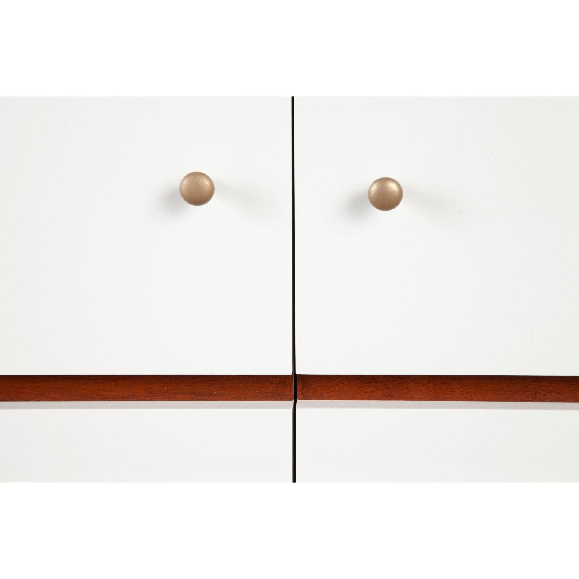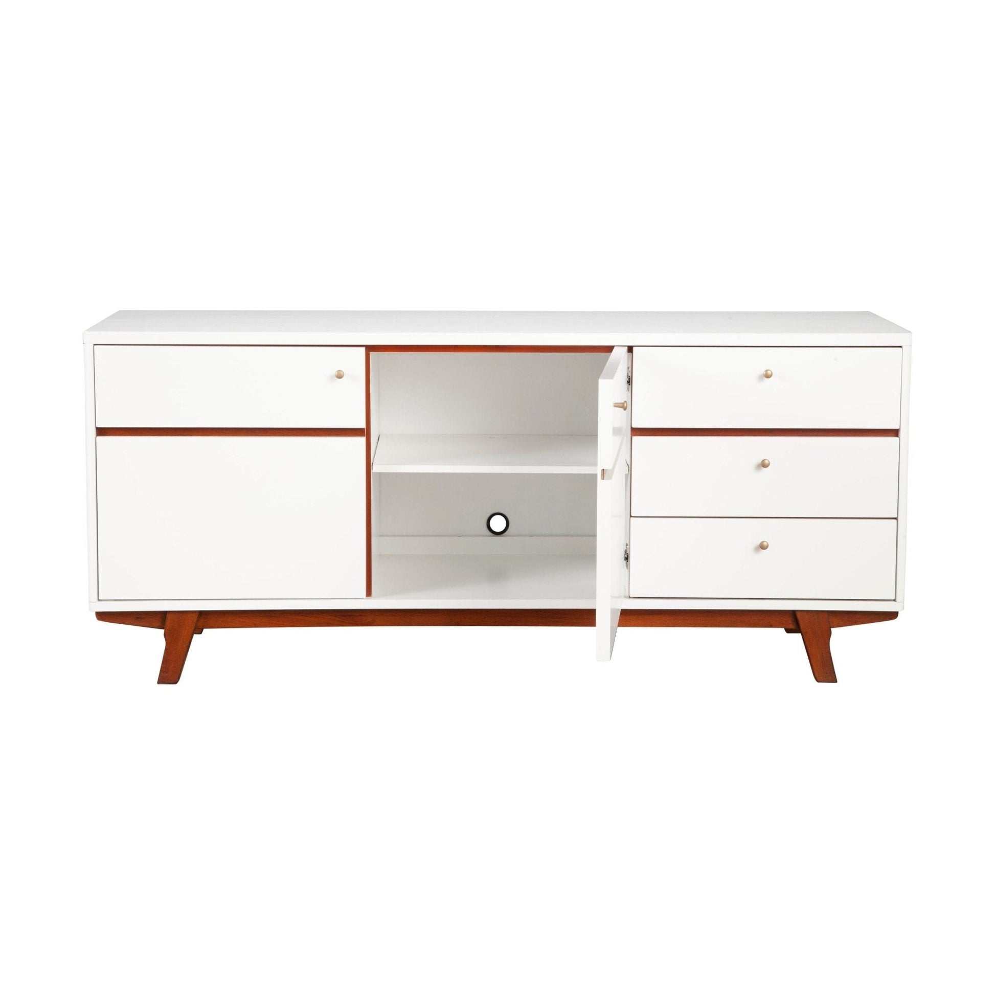 The Dakota wood TV Console combines function with contemporary styling. Mahogany solids and veneers are beautifully finished in White with Acorn trim and base, accented with gold hardware. 2 doors with interior shelves plus 3 drawers provide extensive storage. The piece is finished with a felt-lined top drawer, wire management, and is shipped fully assembled. Coordinates with other items from the Alpine Furniture Dakota collection.