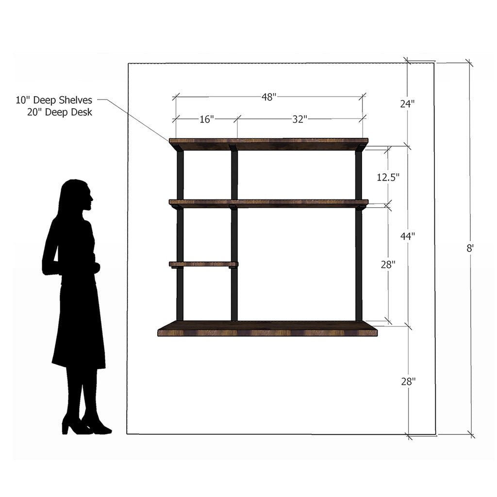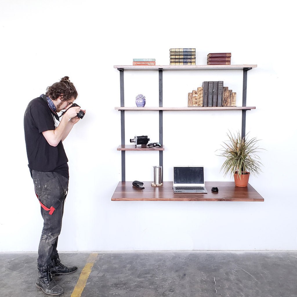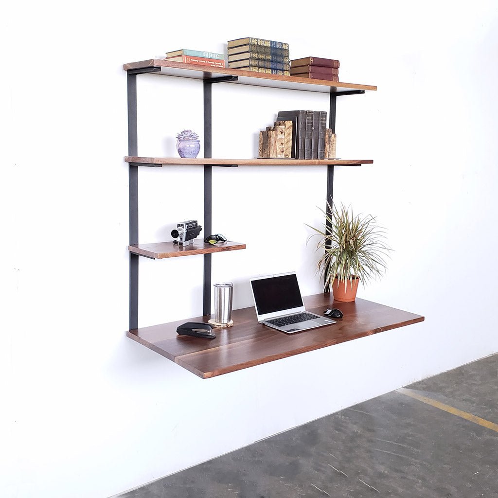 Minimal Wall Mounted Computer Desk with 3 shelves, handmade in USA with solid wood and steel