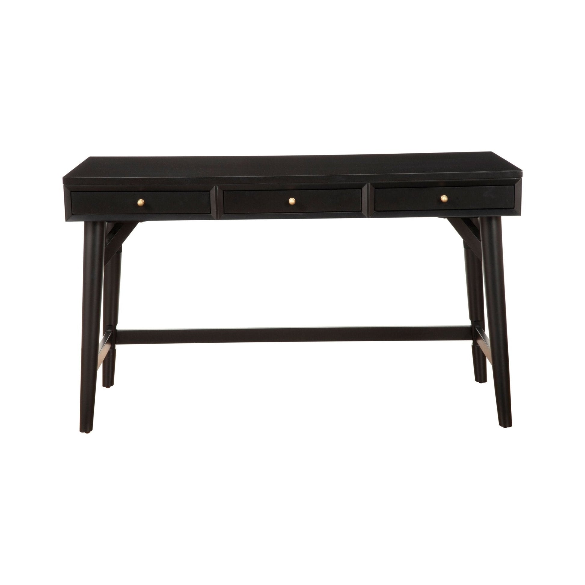 Influenced by Mid-Century design, the Flynn 3-Drawer Desk combines clean-lines and tapered legs for a distinctive look. Featuring Mahogany wood solids and Okume veneer, use this piece to anchor your home office in sophisticated style. Finished in a timeless black, the drawers are felt lined and have accent hardware. Mix and match with other pieces from the Alpine Furniture Flynn collection.