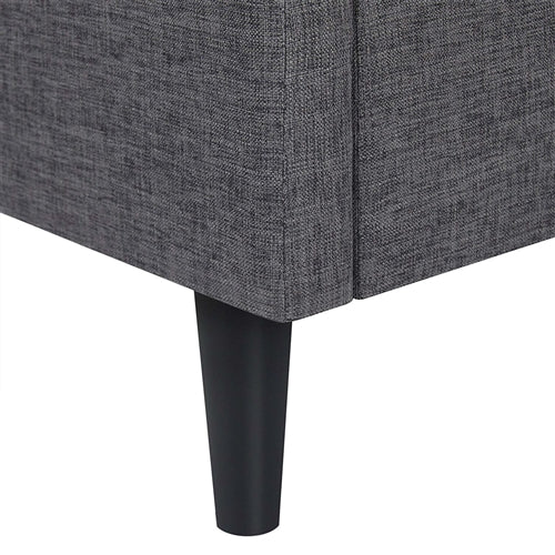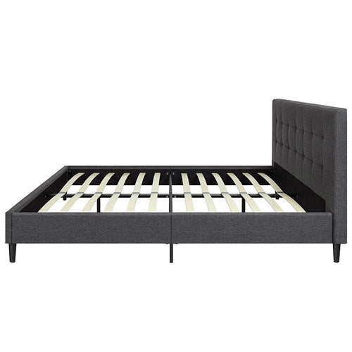 - The bed frame is crafted of durable wood and is complete with upholstered fabric