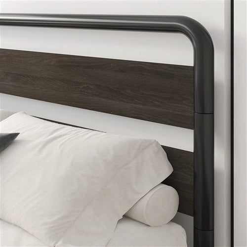 - Heavy Duty Round Metal Frame Platform Bed with Black Wood Panel Headboard