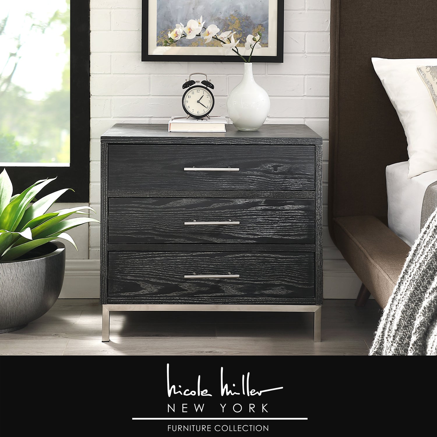 - ATTRIBUTES: 3 Drawers, T-Bar Handle, Brushed Metal Base