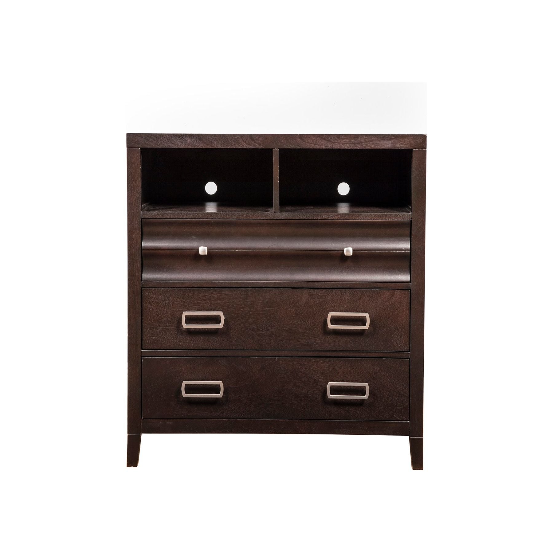 The Legacy wood bedroom media chest features a classic black cherry finish. Alpine Furniture takes pride in the quality of their product, crafted with Plantation Mahogany Wood Solids & Okoume Veneer. 3 drawers for storage feature ball bearing metal drawer glides and French & English Dovetail construction with a felt lined top drawer. Holes in open storage area for electrical wires.