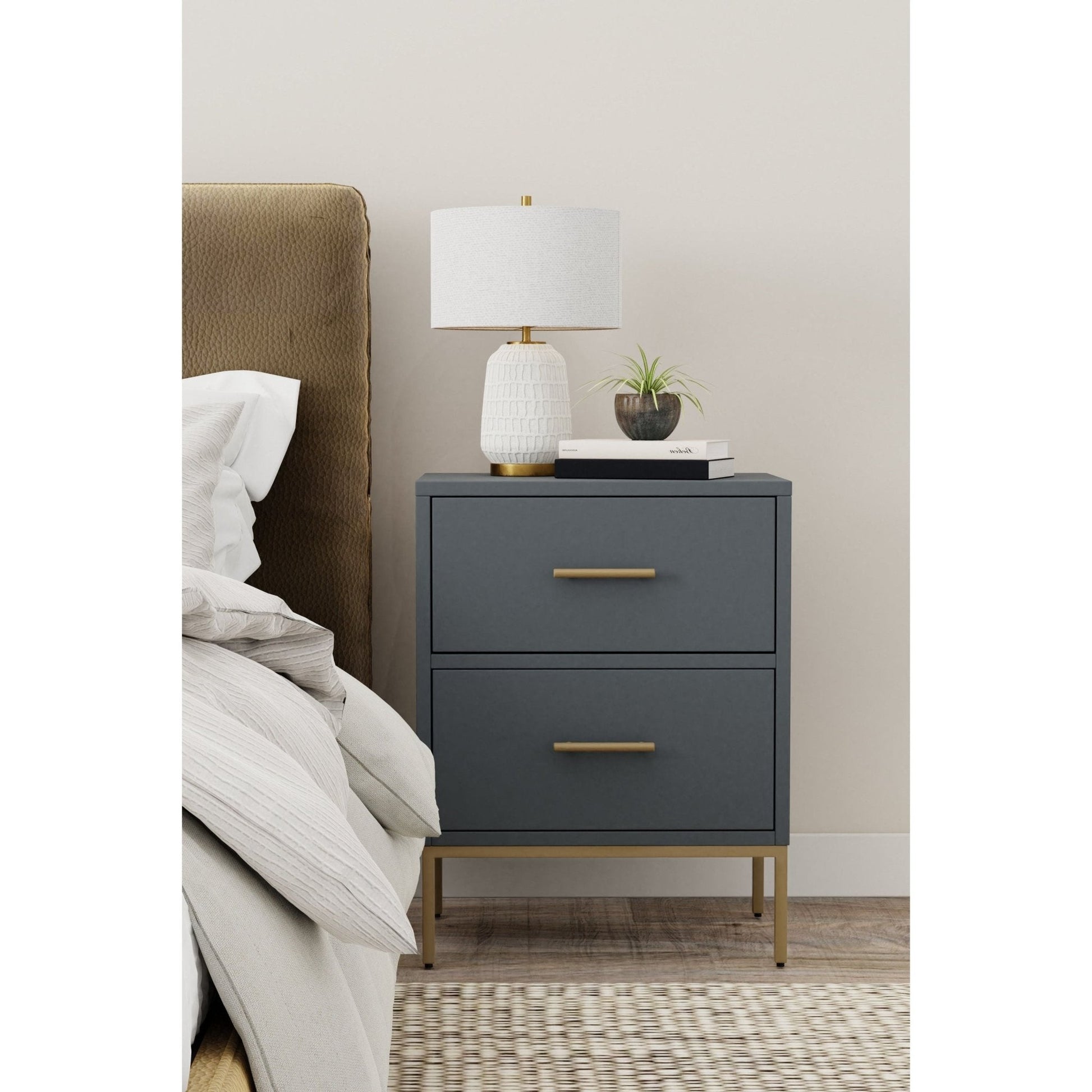 Add modern flair to your bedroom with the Madelyn Slate Gray 2-Drawer Nightstand. Providing storage for your essentials, this piece is crafted from sustainably sourced Mahogany. Features include a felt-lined top drawer, English dovetail construction and metal ball bearing drawer glides. The clean lines and beautiful finish blend effortlessly in any decorating scheme. Coordinates with other pieces in the Alpine Furniture Madelyn bedroom collection sold separately.