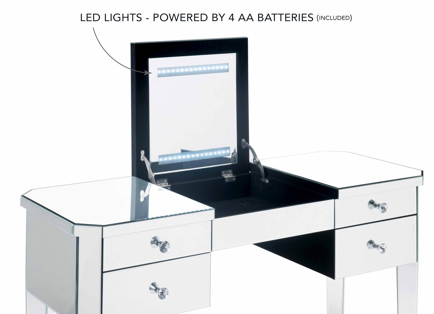 - LED - Flip top is enhanced with LED lights, which gives you perfect brightness to put make up on or do your hair. Now you can ensure your makeup is flawlessly blended and smudge free. Powered by 4 AA batteries (included).