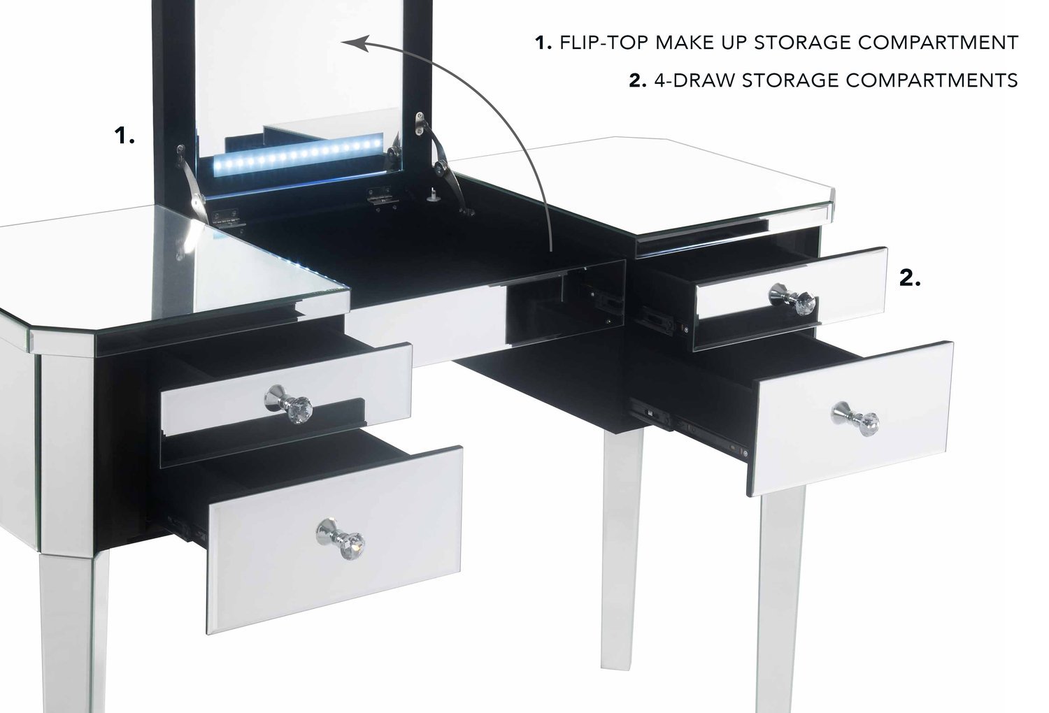 - ATTRIBUTES: Mirrored, 4 Drawers, Lift-up Top
