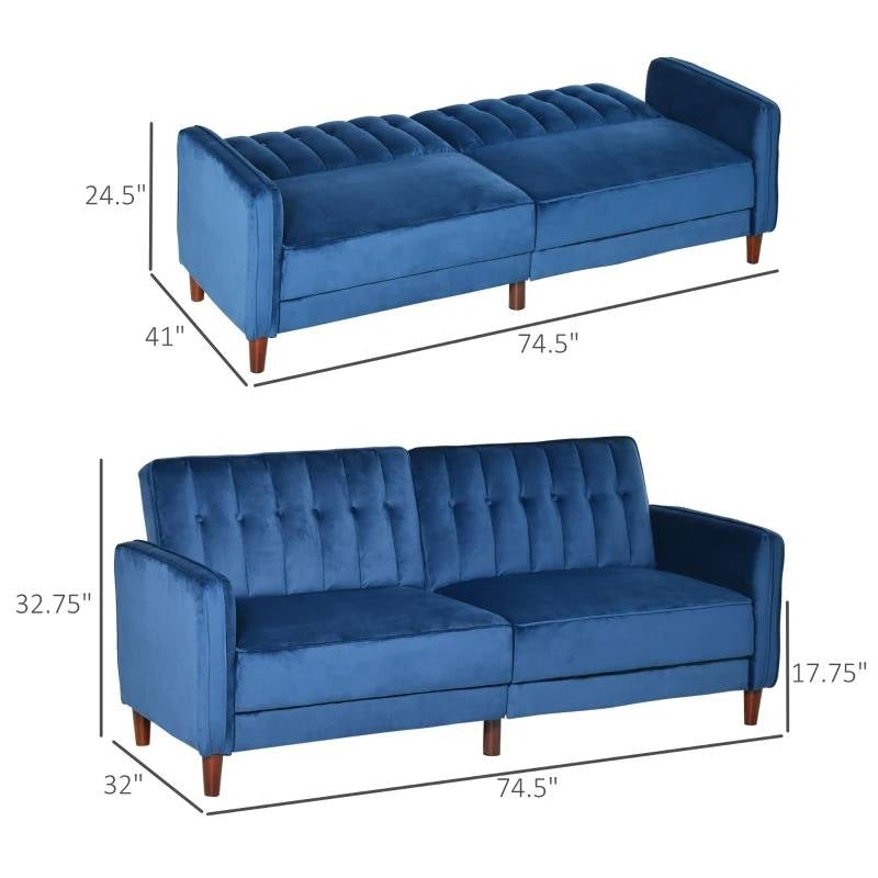 - Mid-Century Modern Futon Sleeper Sofa Bed in Blue Velvet Upholstery