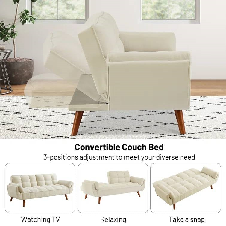 Mid-Century Modern Sleeper Sofa Bed in Beige Linen Polyester Tufted Upholstery