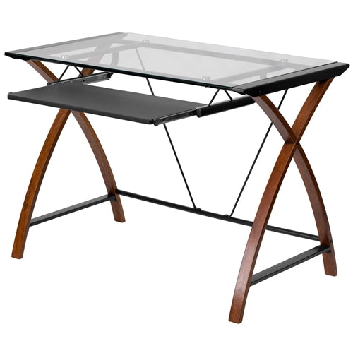 Modern Cherry Finish Glass Top Writing Table Computer Desk with Keyboard Tray