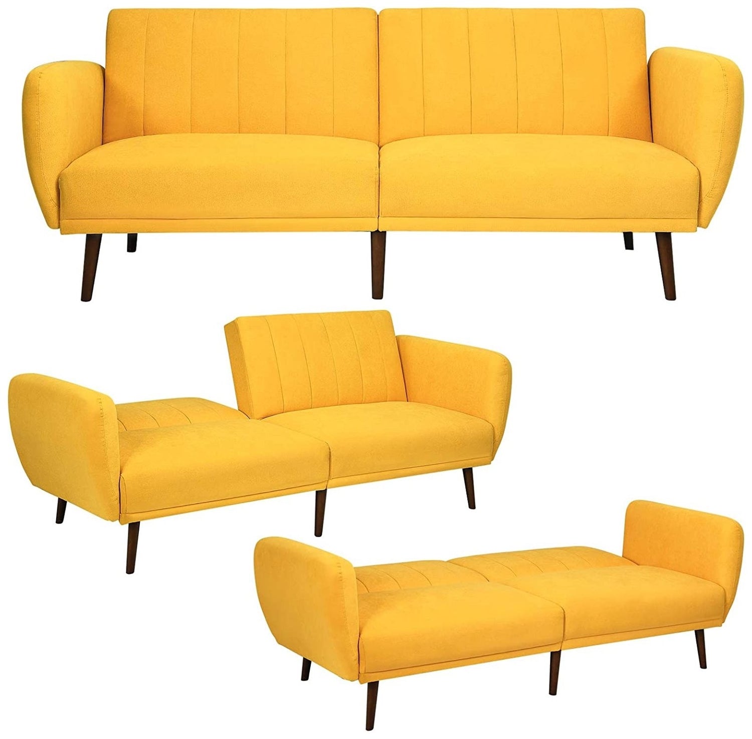 Modern Scandinavian Yellow Linen Upholstered Sofa Bed with Wooden Legs