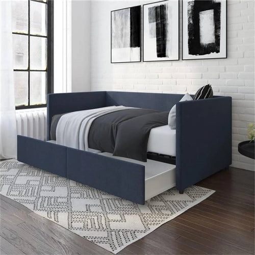 - Navy Blue Linen Upholstered Daybed with Pull-Out Storage Drawers