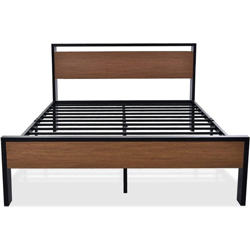 - Queen Metal Platform Bed with Walnut Finish Wood Panel Headboard Footboard