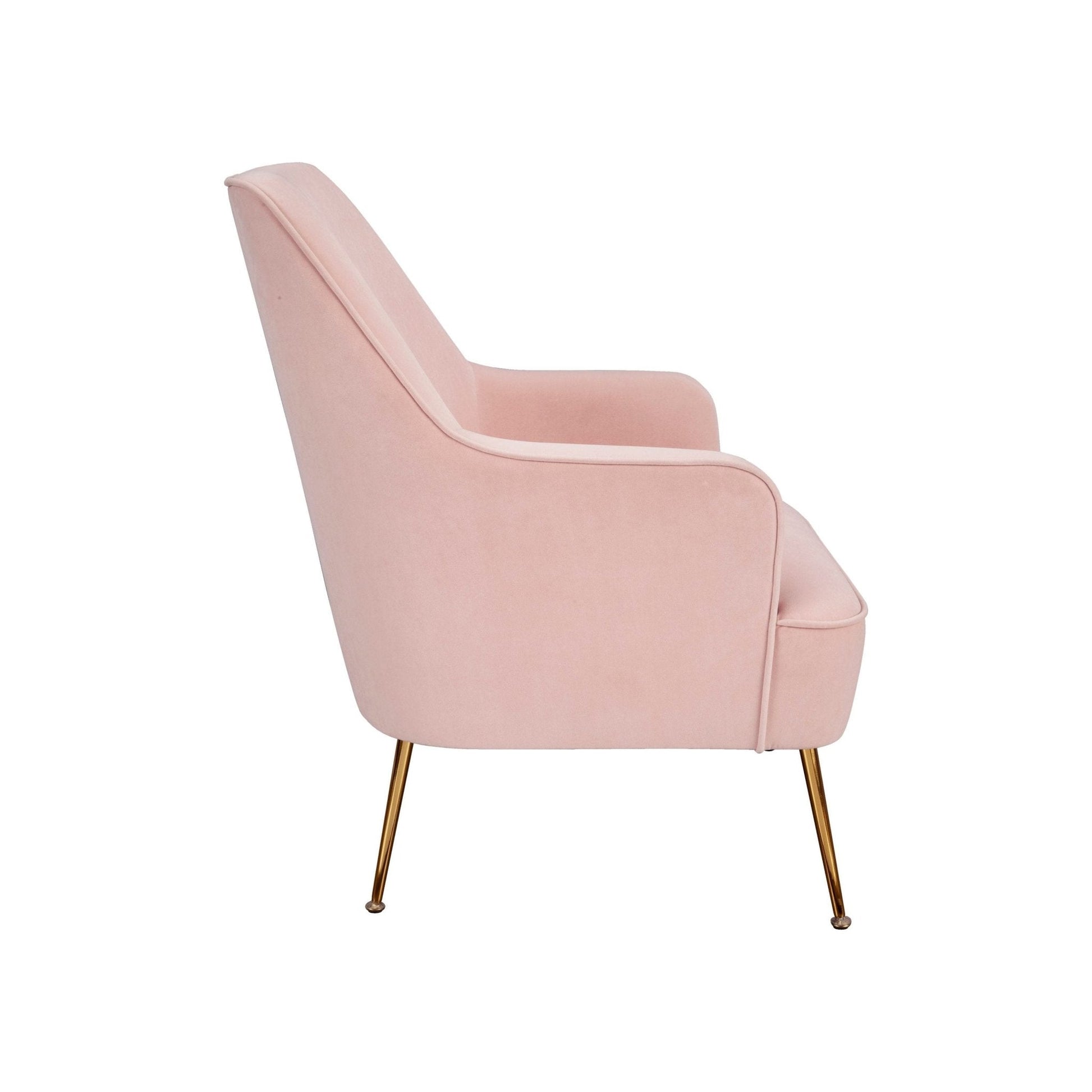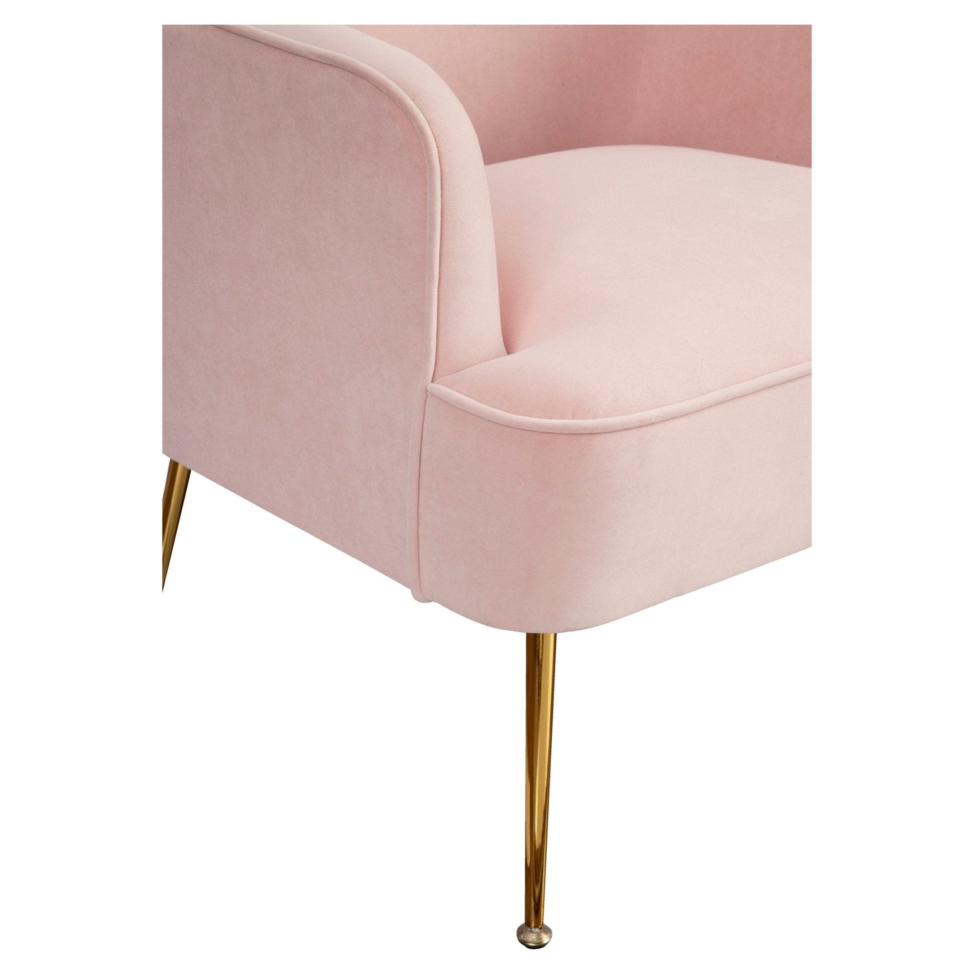 Curl up with a good book in the Rebecca leisure chair that makes for a chic accent to your modern decor. Made with smooth, velvety fabric of a soft pink hue, this armchair is crafted with a tall back that slopes into wide arms to encircle you in its plush coziness. Slender yet sturdy gold legs provide a pop of on-trend glamour and the matching footrest sold separately just adds that extra layer of comfy. Showcase this eye-catching side chair in your living room, bedroom, or even in an entryway to provide your guest the most comfortable seating.