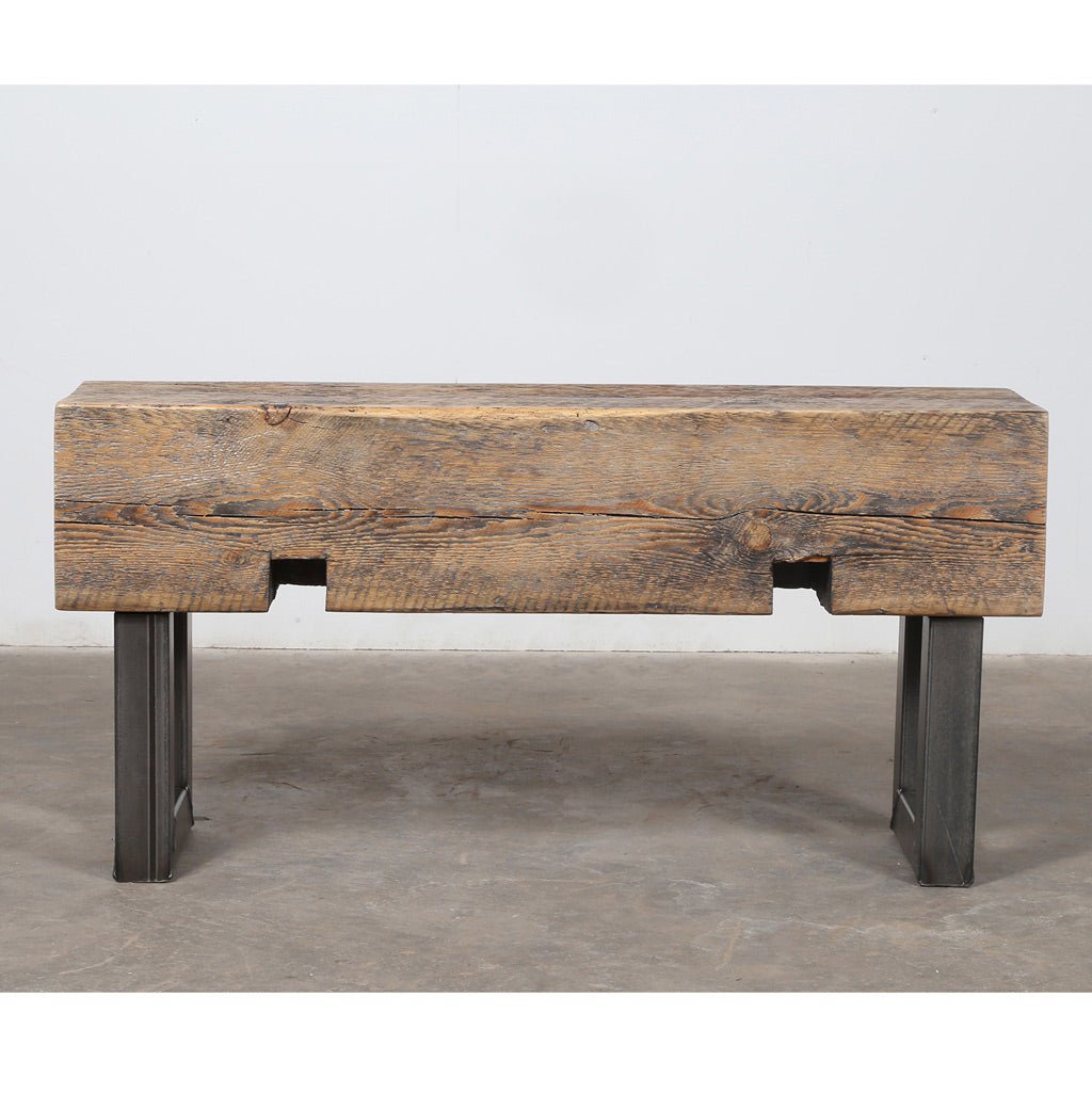 Rustic industrial bench hand-made with solid 8"x10" reclaimed pine beam and American 2" square steel tube legs.