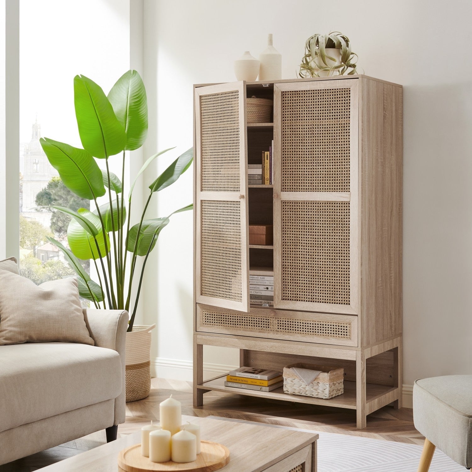 - CRAFTED TO PERFECTION - Our rattan storage cabinet has 2 doors, 1 drawer, 5 shelves, 1 hanging rod, and 1 open shelf and is expertly woven to ensure strength and durability, making it the perfect addition to your home for years to come.