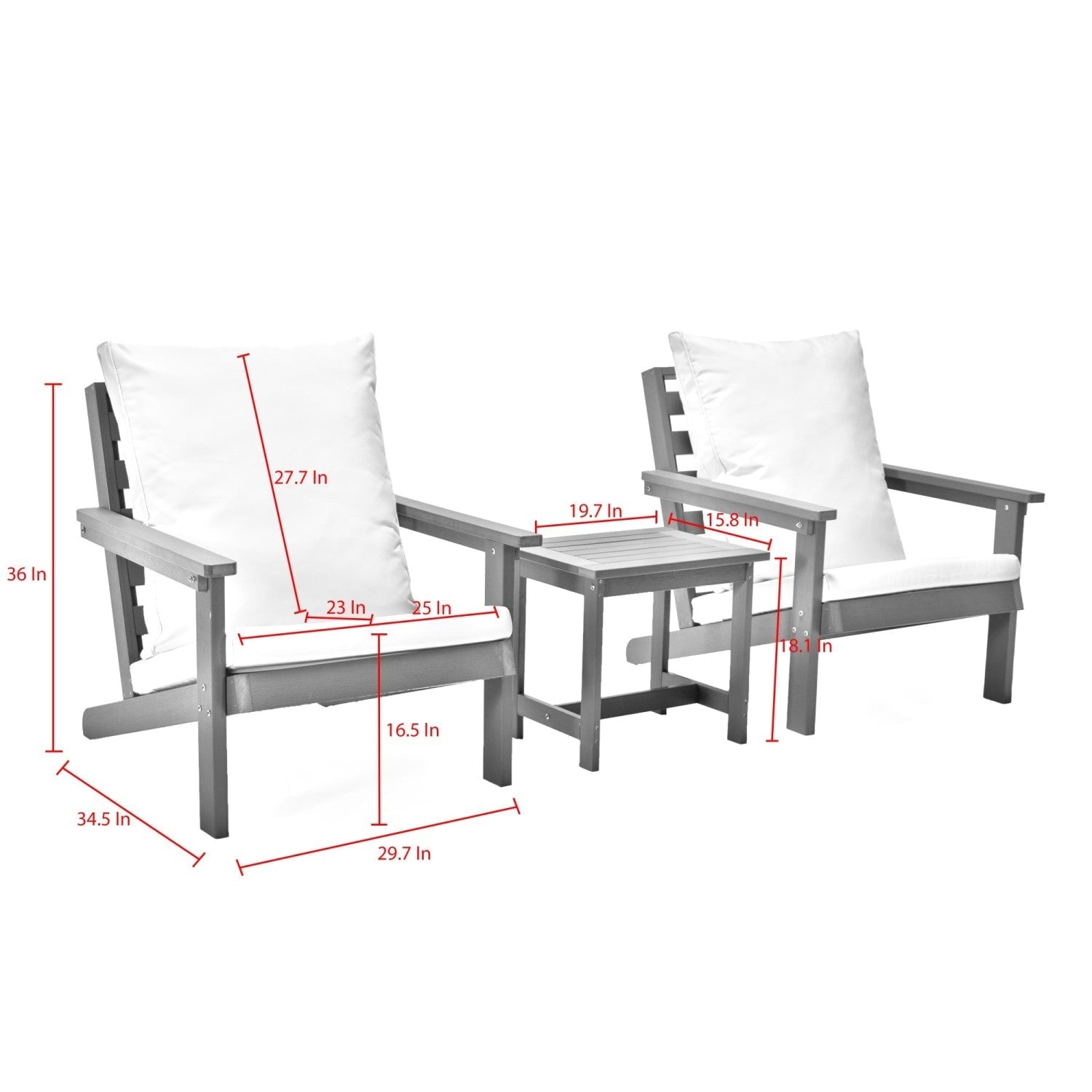 - PRODUCT DIMENSION - Chair: 29.7"L x 34.5"W x 36"H. Side Table: 19.7"L x 15.8"W x 18.1"H