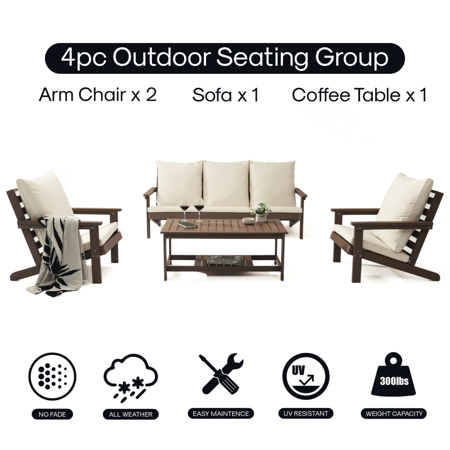 - ELEGANT DESIGN - Modern style 4-pc seating group (1 sofa, 2 armchairs, 1 coffee table) is made with strong and durable all-weather materials, combining convenient style and function. The fade-proof design is perfect for indoor and outdoor settings.