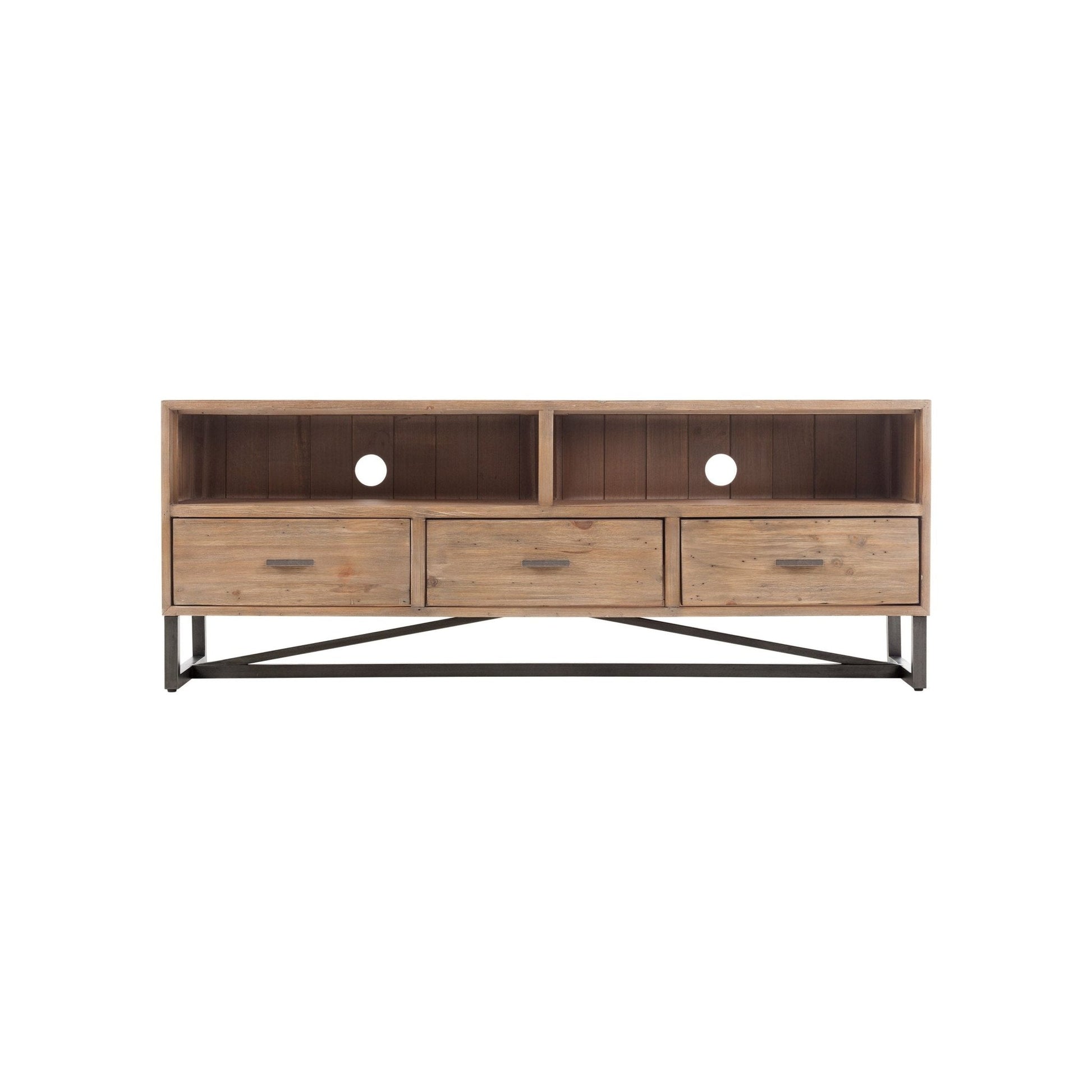 This piece bestows elegance with the splendor of a unique Dry Sand (Beige) finish and the nature of reclaimed pine wood and metal legs. This console is a reminder of classic construction built to last. Featuring 3 drawers and two open cabinets as well as holes for wire management and can accommodate most electronic devices. Console comes fully setup.