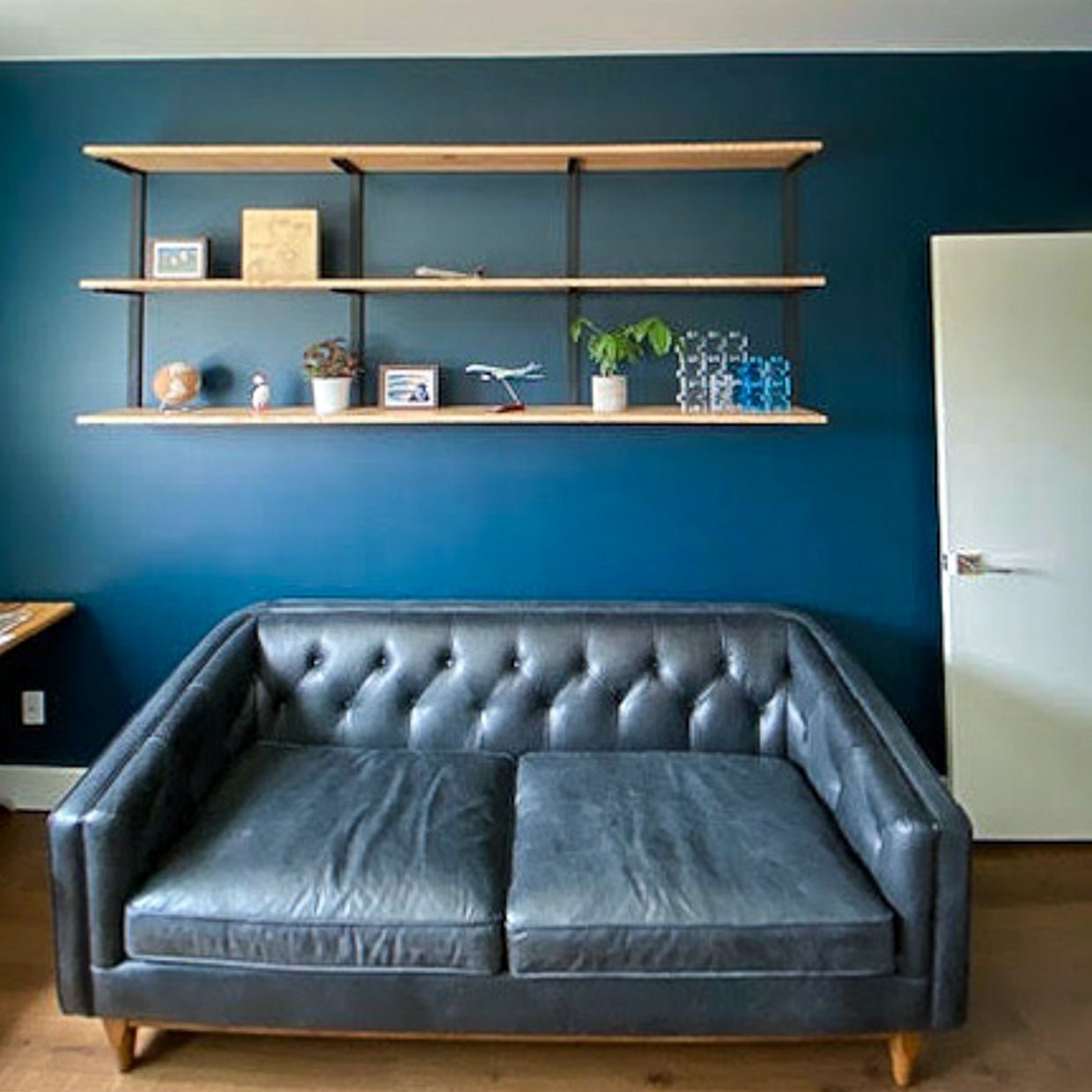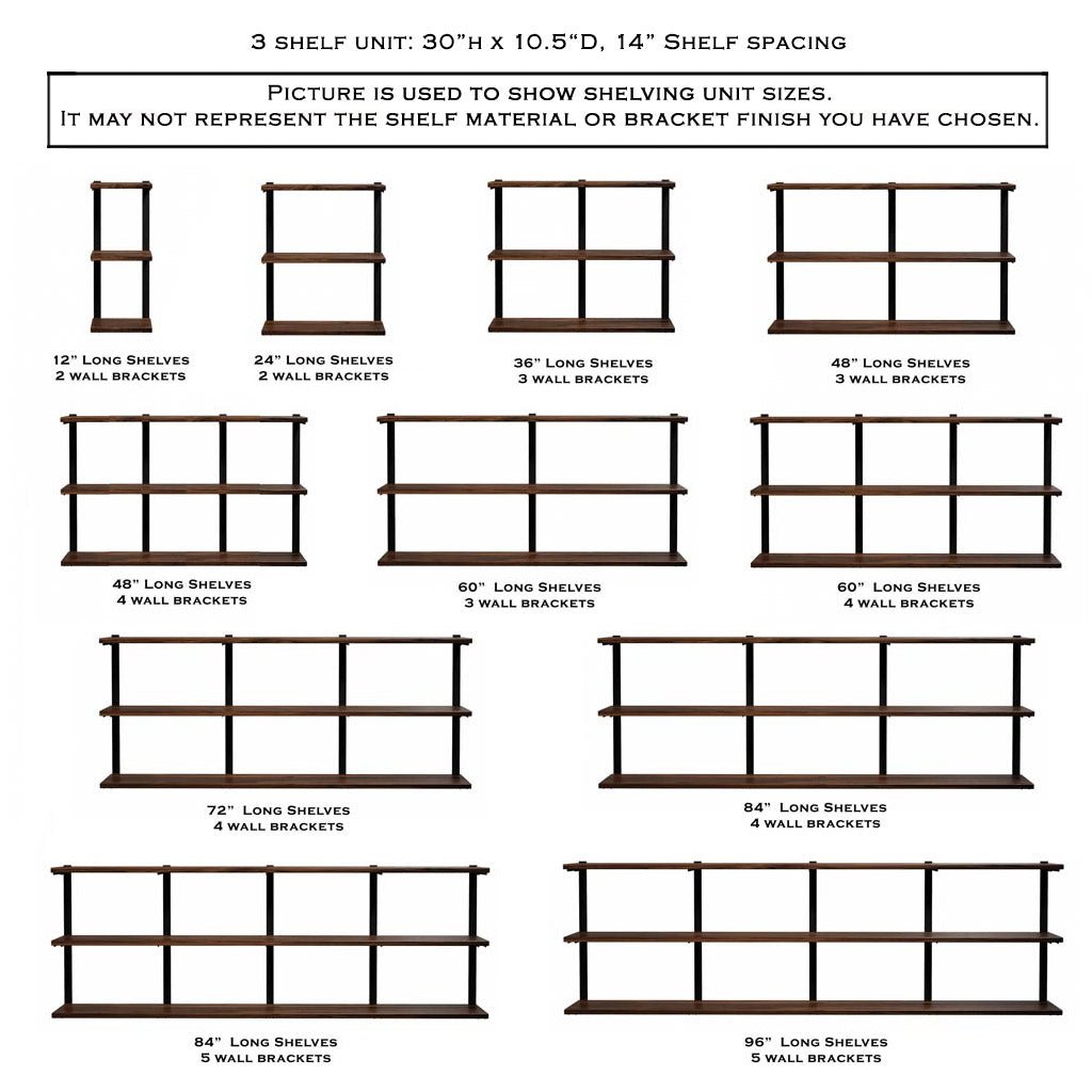 We proudly design and manufacture this 3 tier wall-mounted shelving unit in the USA. We use only the highest quality, American made steel, premium solid wood, and commercial grade finishes. The solid wood shelves are 10" deep and can be ordered in any length up to 96" long. Brackets are custom fabricated from 1.5" solid American steel channel and finished with an extremely durable powder coating.
