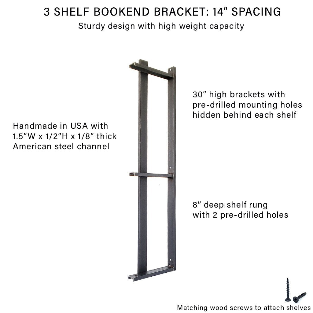 We proudly design and manufacture this 3 tier wall-mounted shelving in the USA. We use only the highest quality, American made steel, premium solid wood, and commercial grade finishes. The solid wood shelves can be ordered in any solid length up to 96" long. Brackets are custom fabricated from 1.5" solid American steel channel and finished with an extremely durable powder coating.