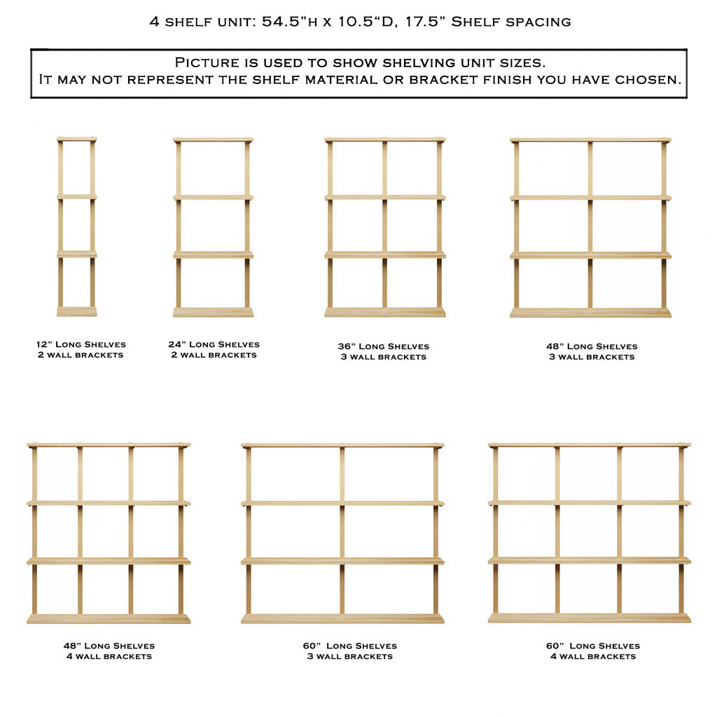 Personalize your custom shelving unit to fit your aesthetic by choosing from our 5 different wood options and 3 different bracket finishes. No matter the combination, our shelving will enhance your space with quality materials, sure to last a lifetime.
