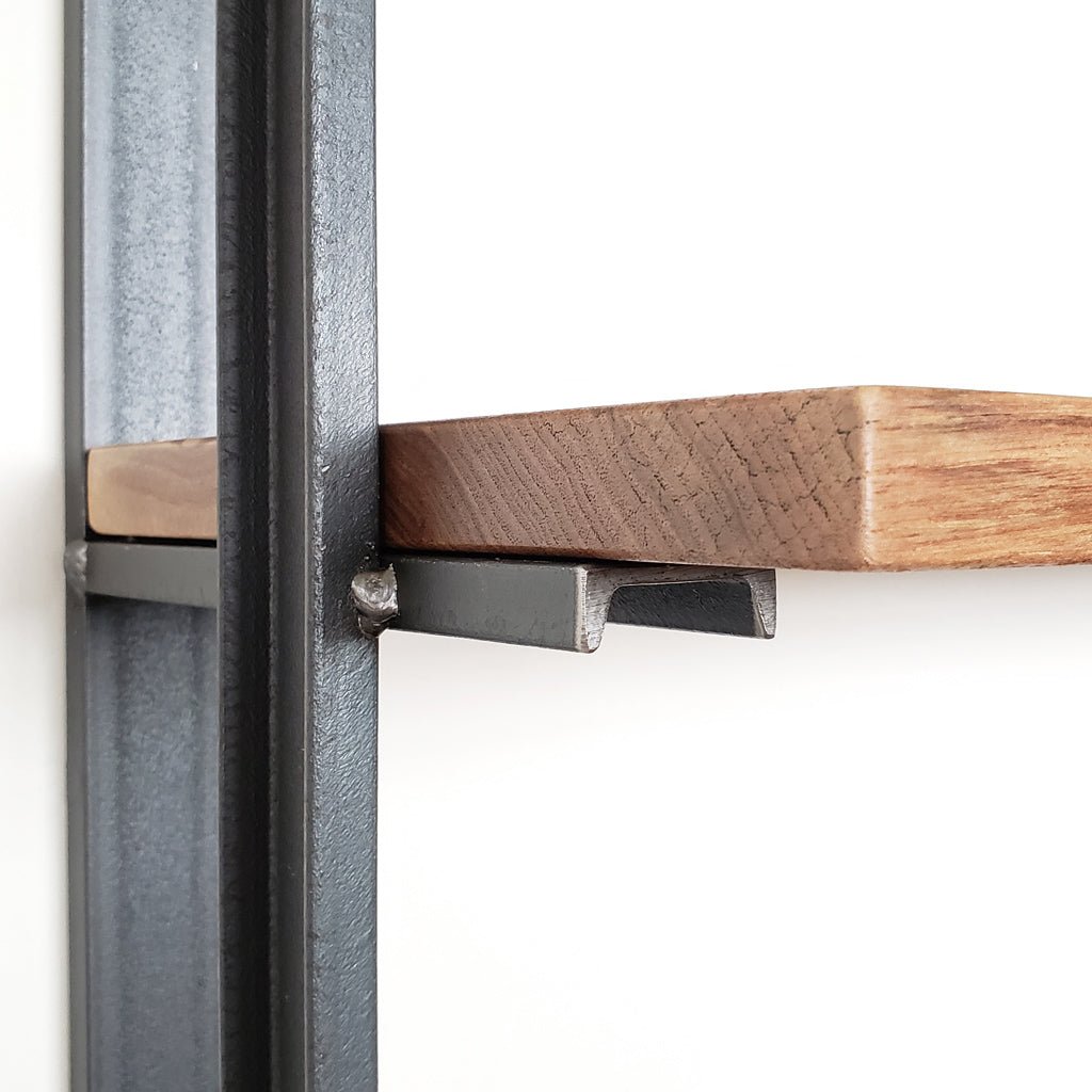 Our largest wall mounted bookcase is sure to make a statement at 7-1/2 ft high with 6 shelves. This unique bracket incorporates bookends to keep your items securely held on the shelves. The vertical steel adds an architectural element to the design while allowing more storage space on the shelves.