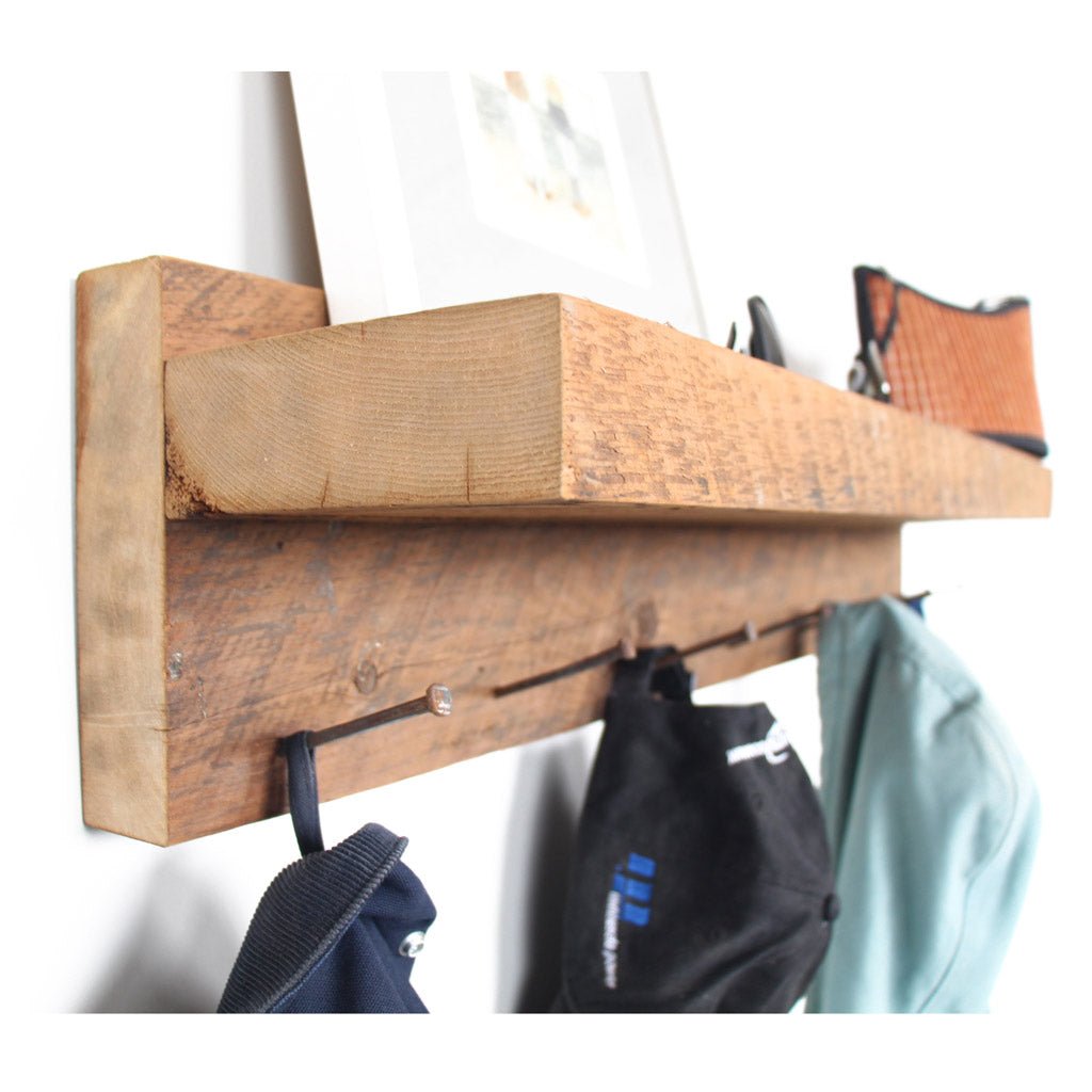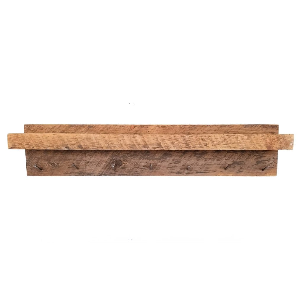 Our custom wood coat racks are skillfully handcrafted in the U.S. from reclaimed pine. They feature seven hooks created from authentic square nails used more than 100 years ago. This versatile reclaimed wood coat rack serves as an excellent entryway shelf and can also be utilized as a towel rack or a spice shelf with convenient hanging space for coffee mugs.